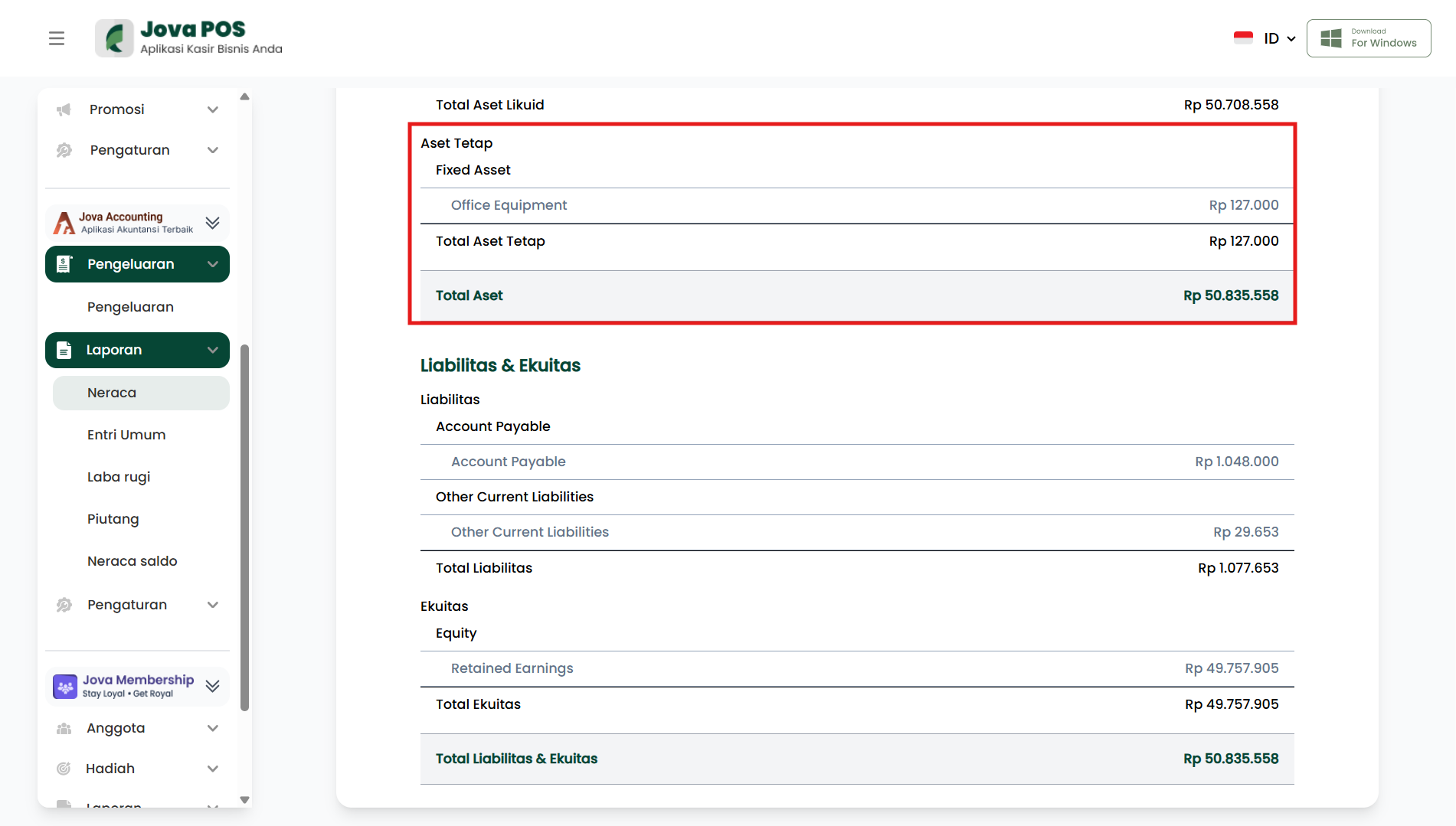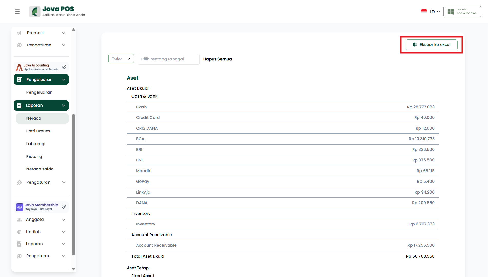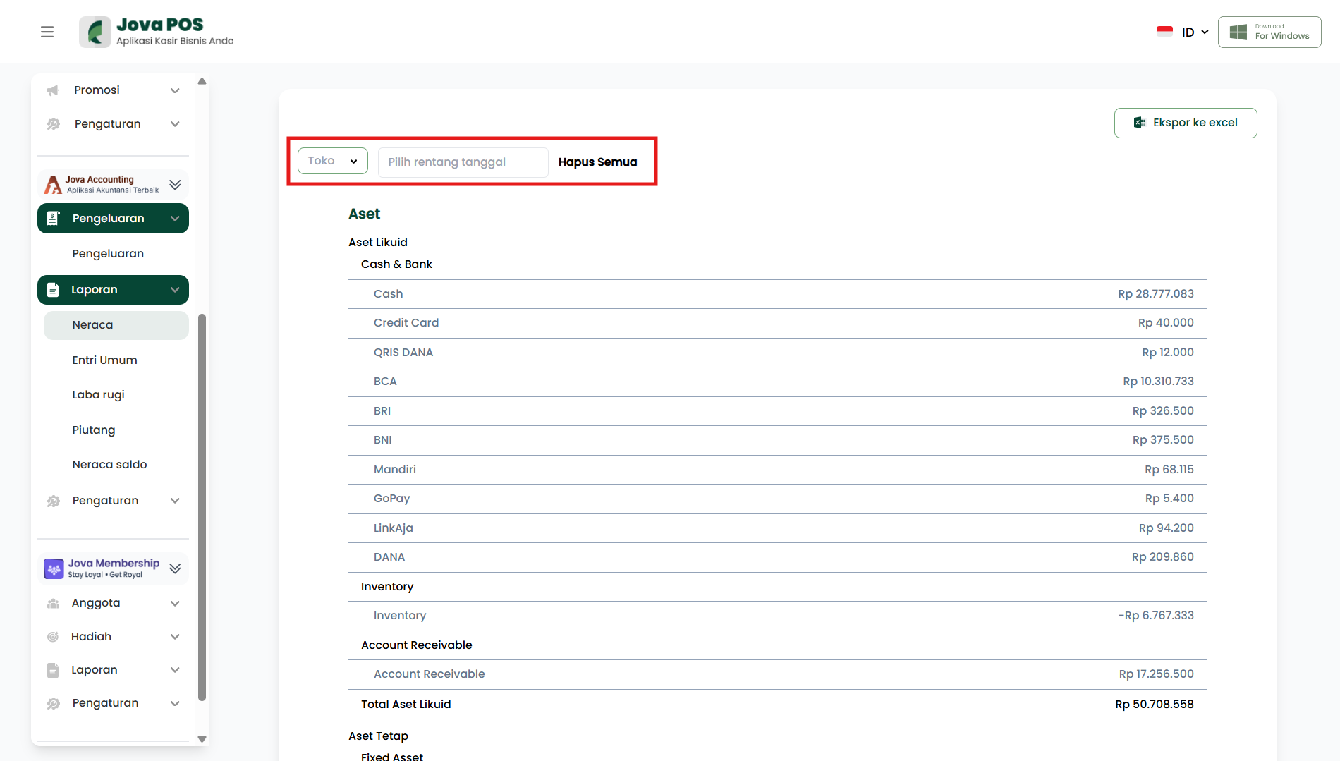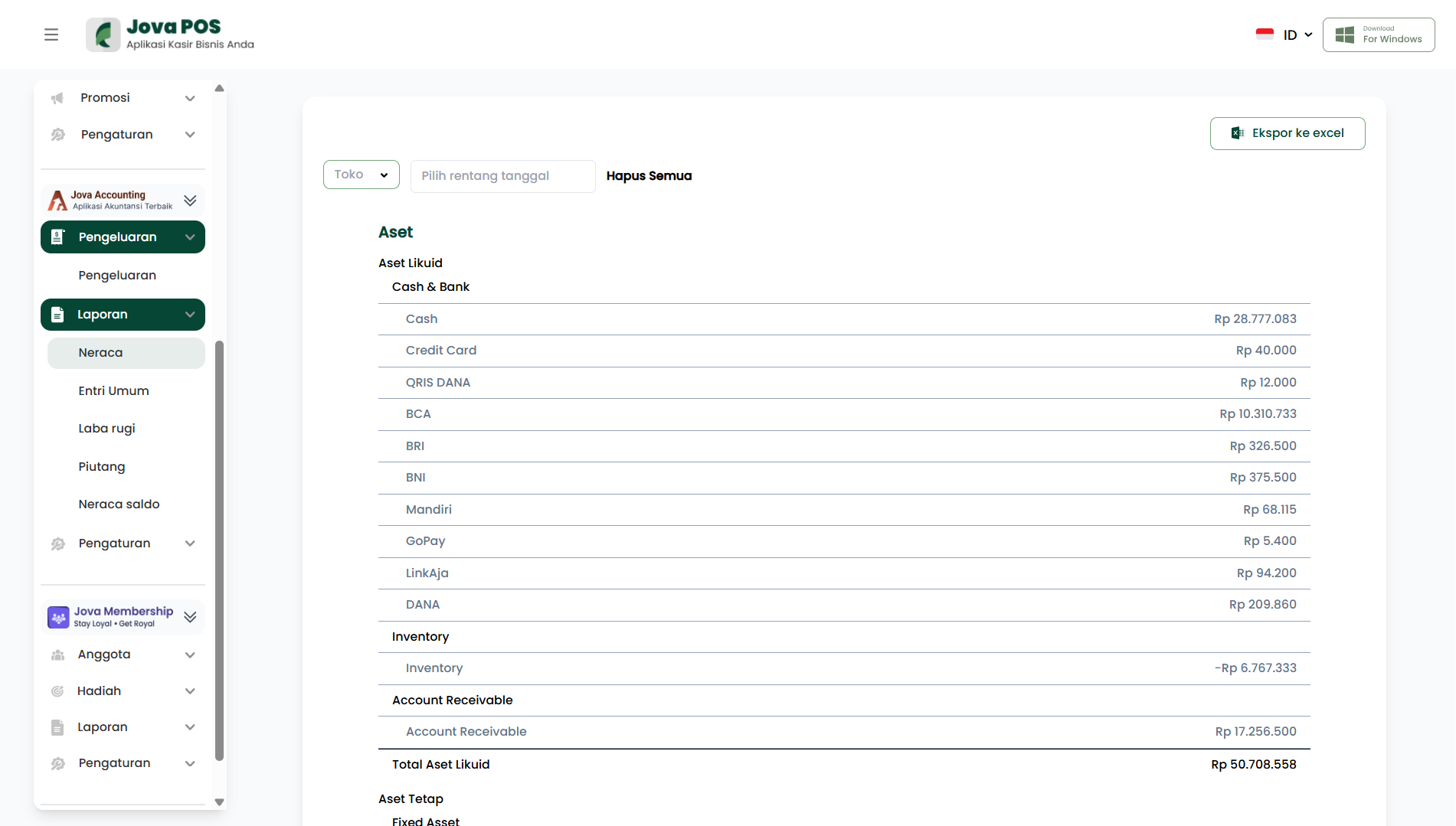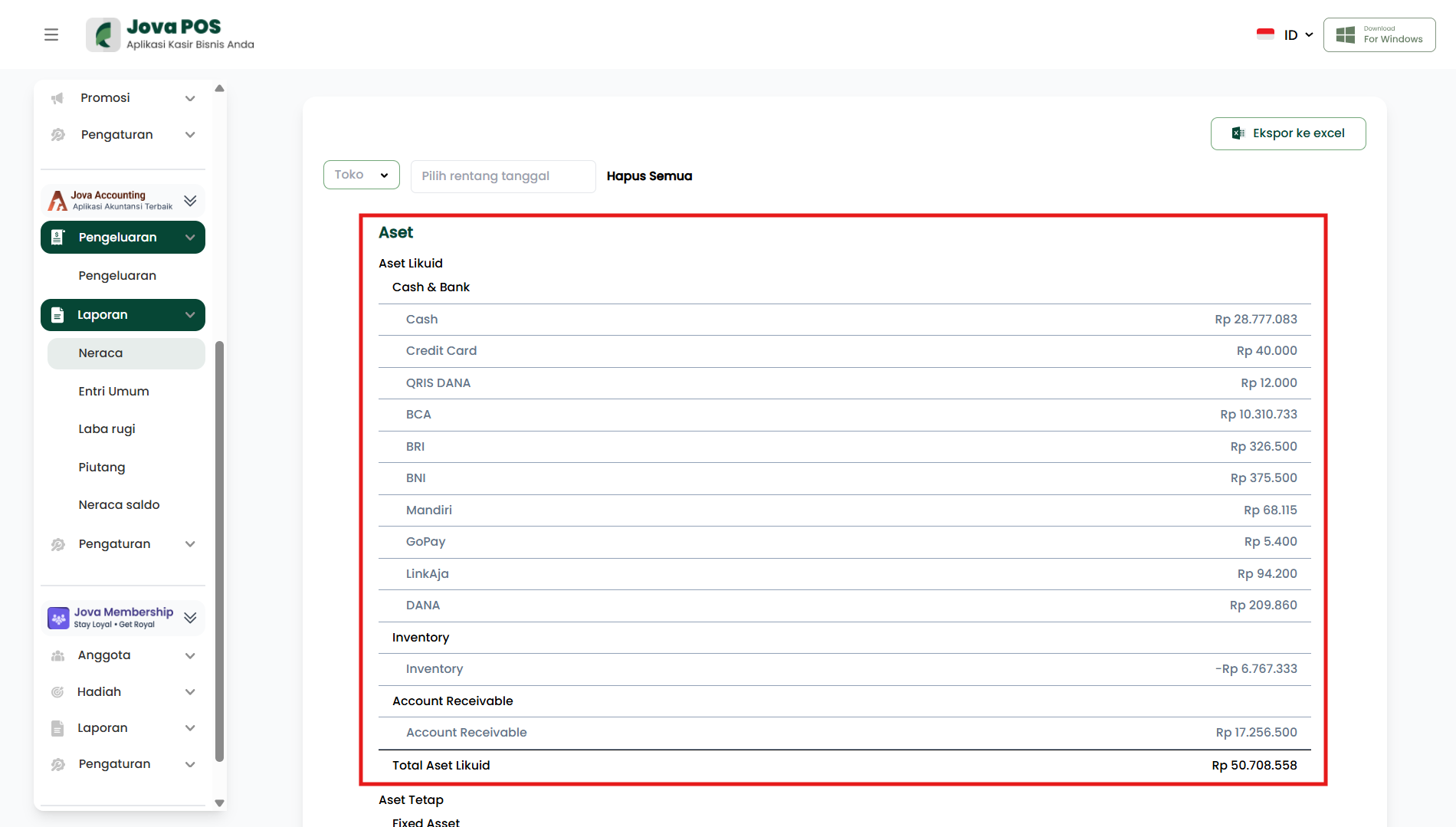 Bagian Aset menunjukkan nilai kekayaan yang dimiliki toko. Aset dikelompokkan menjadi dua kategori utama, yaitu Aset Likuid dan Aset Tetap.