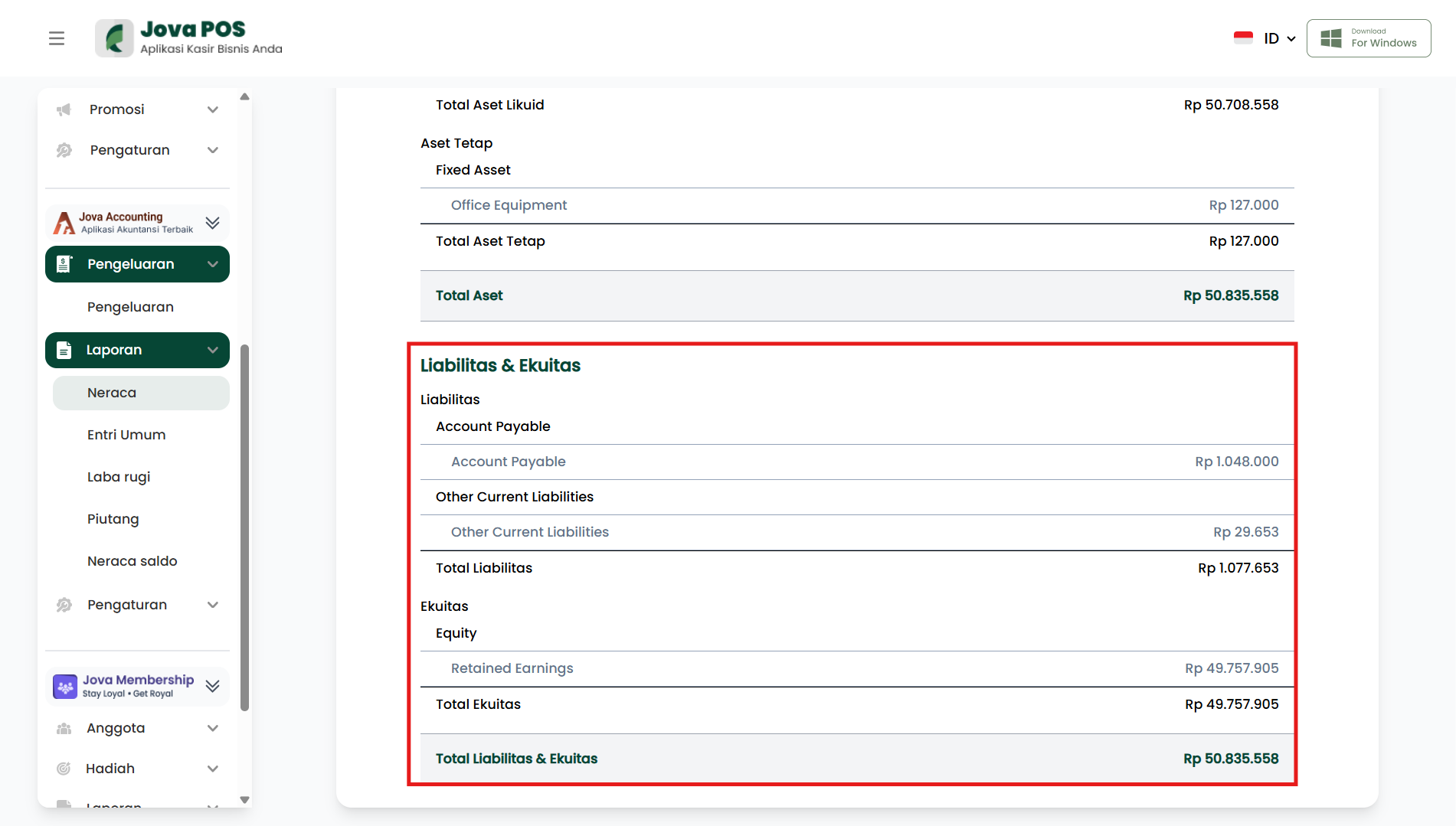 Di akhir bagian ini, akan muncul Total Liabilitas dan Ekuitas, yang seharusnya sama dengan Total Aset jika laporan tersebut seimbang.