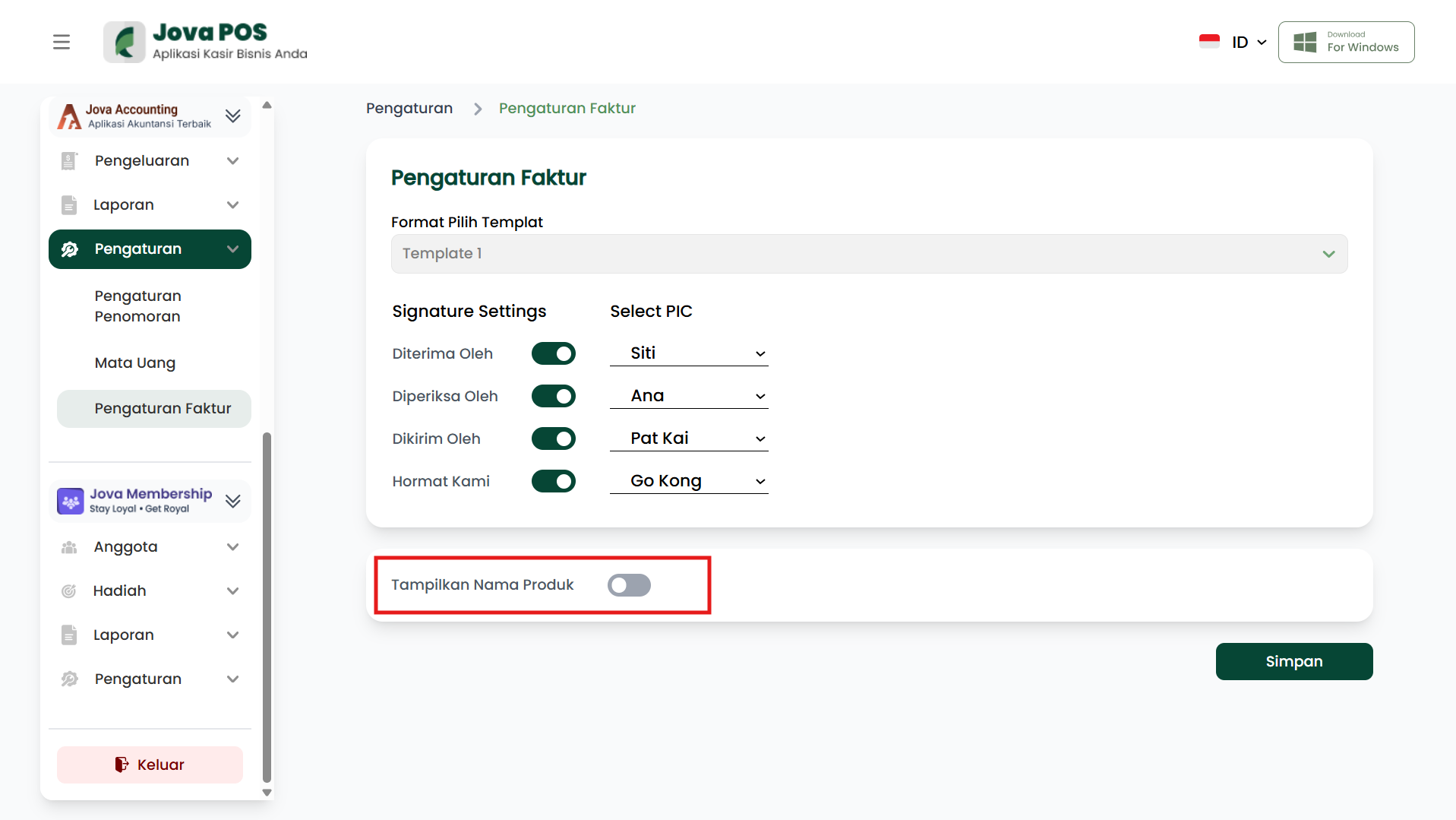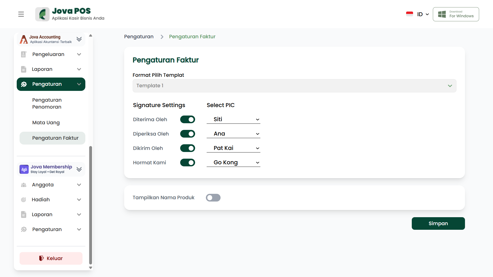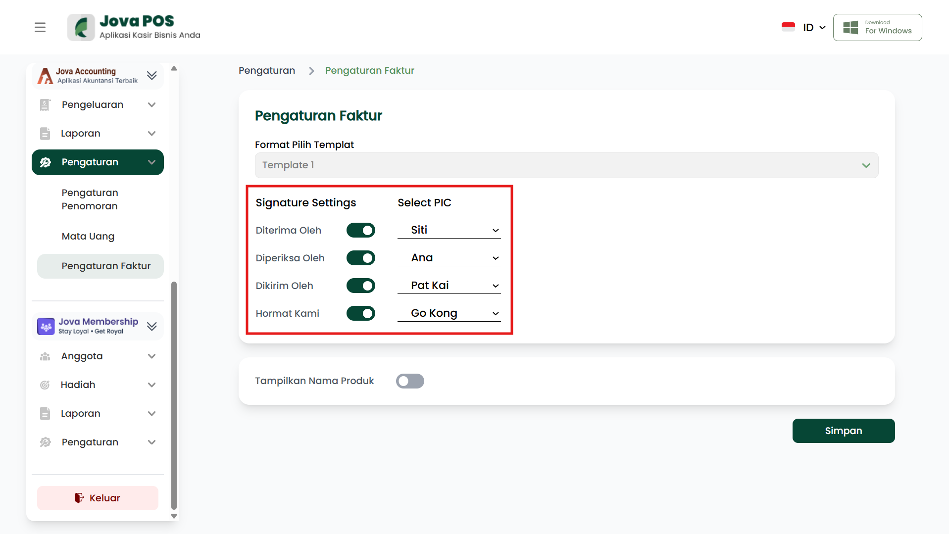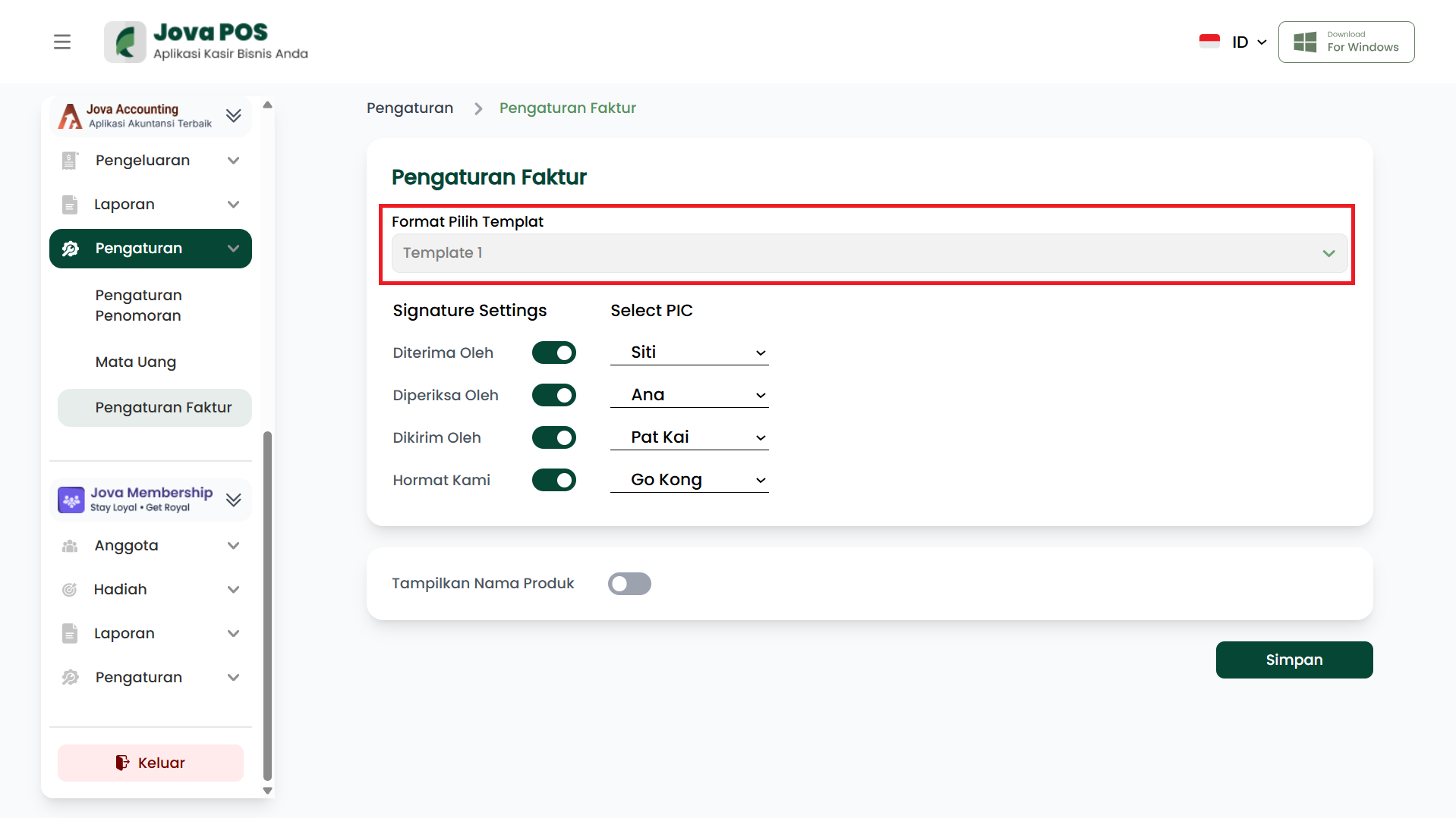 Menu Pengaturan Faktur digunakan untuk menyesuaikan tampilan dan pengaturan pada faktur yang diterbitkan oleh sistem Jova POS. Kamu dapat memilih template, mengatur tanda tangan, serta memilih apakah ingin menampilkan nama produk pada faktur.