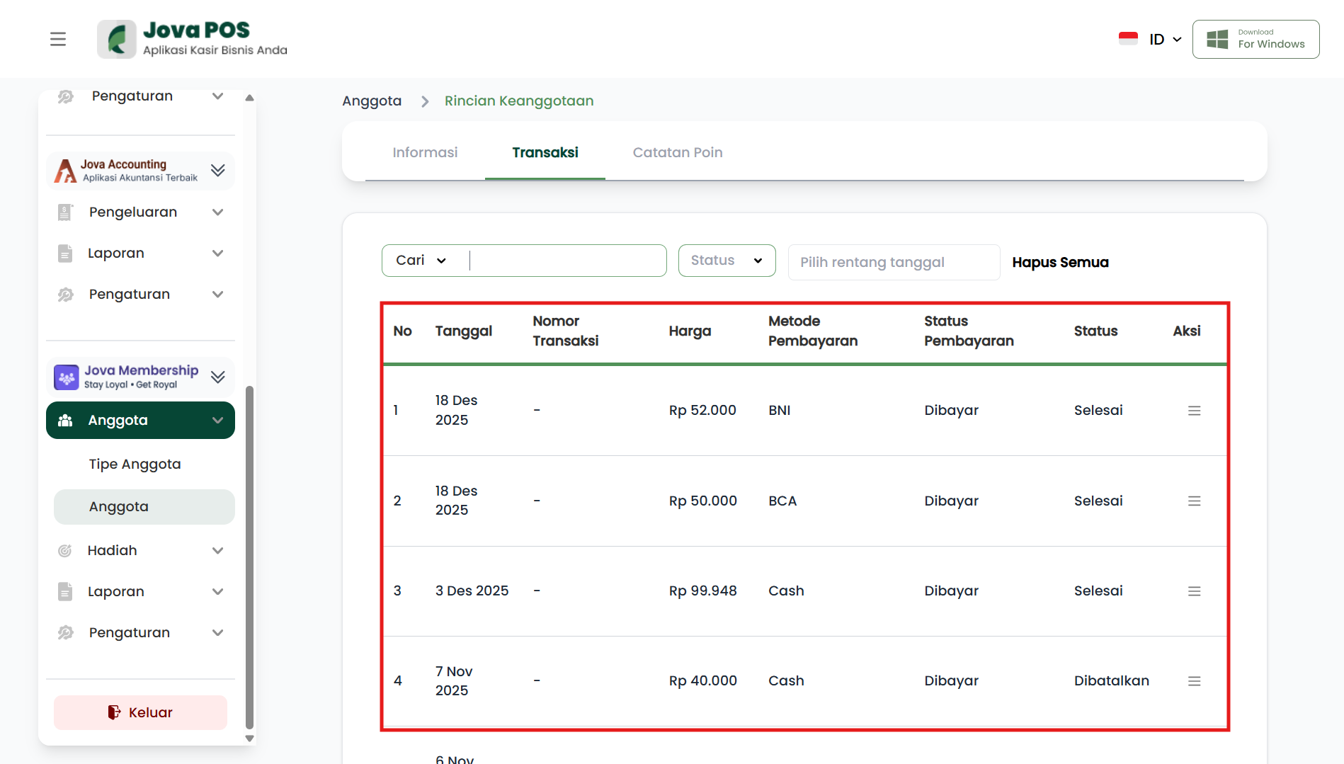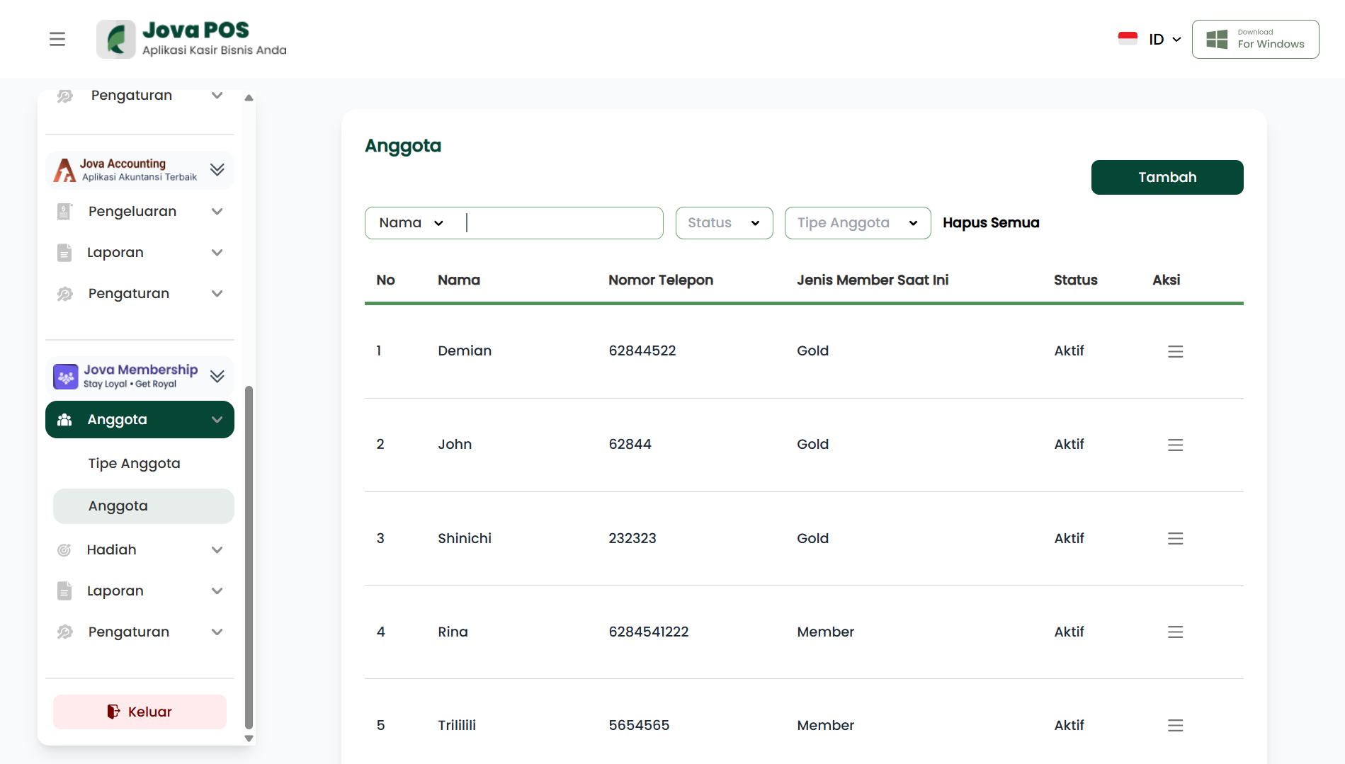 Anggota (Membership) adalah fitur untuk mengelola program loyalitas pelanggan di Jova POS. Fitur ini memungkinkan Anda membuat sistem keanggotaan, memberikan poin, dan menawarkan hadiah kepada pelanggan setia.