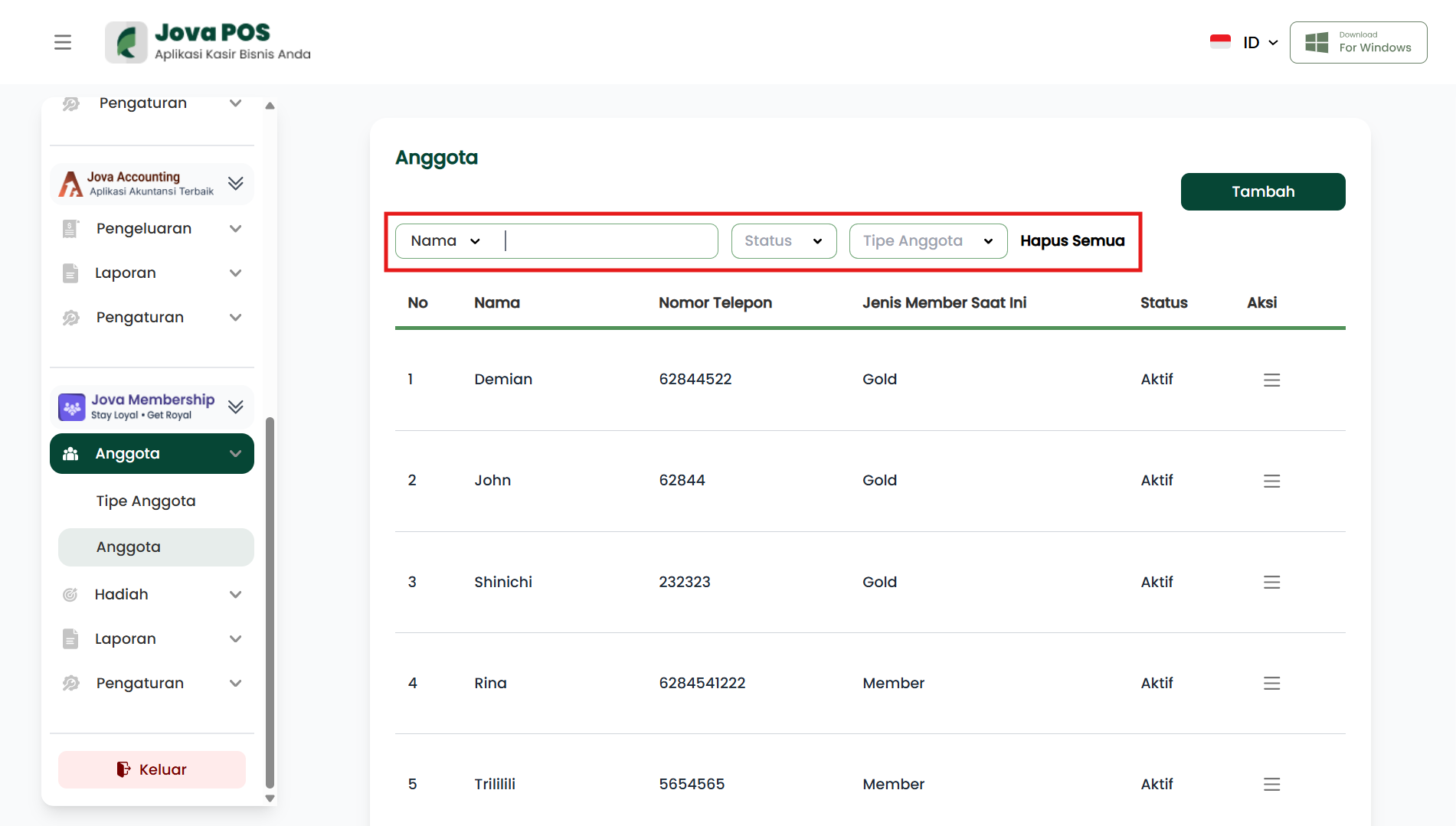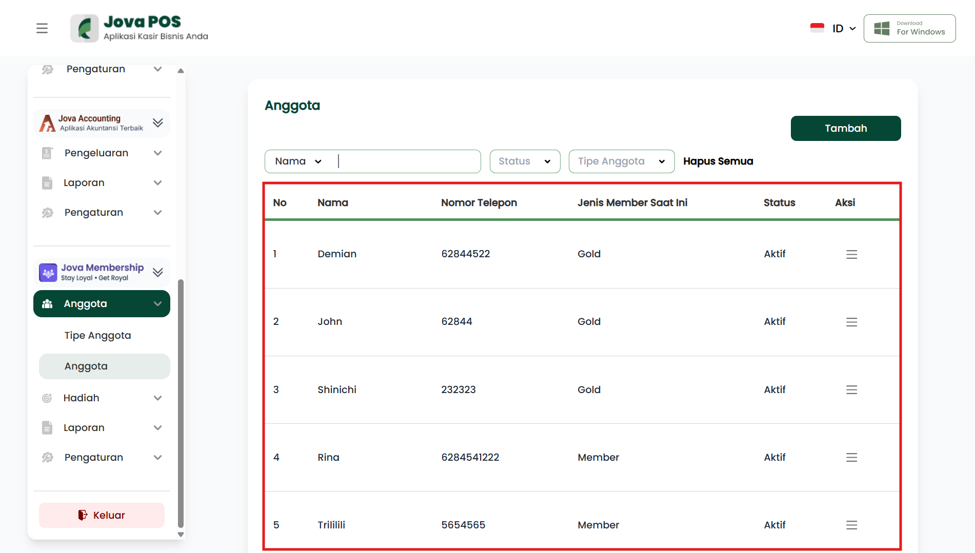 • Status: Status keanggotaan (Aktif/Nonaktif)