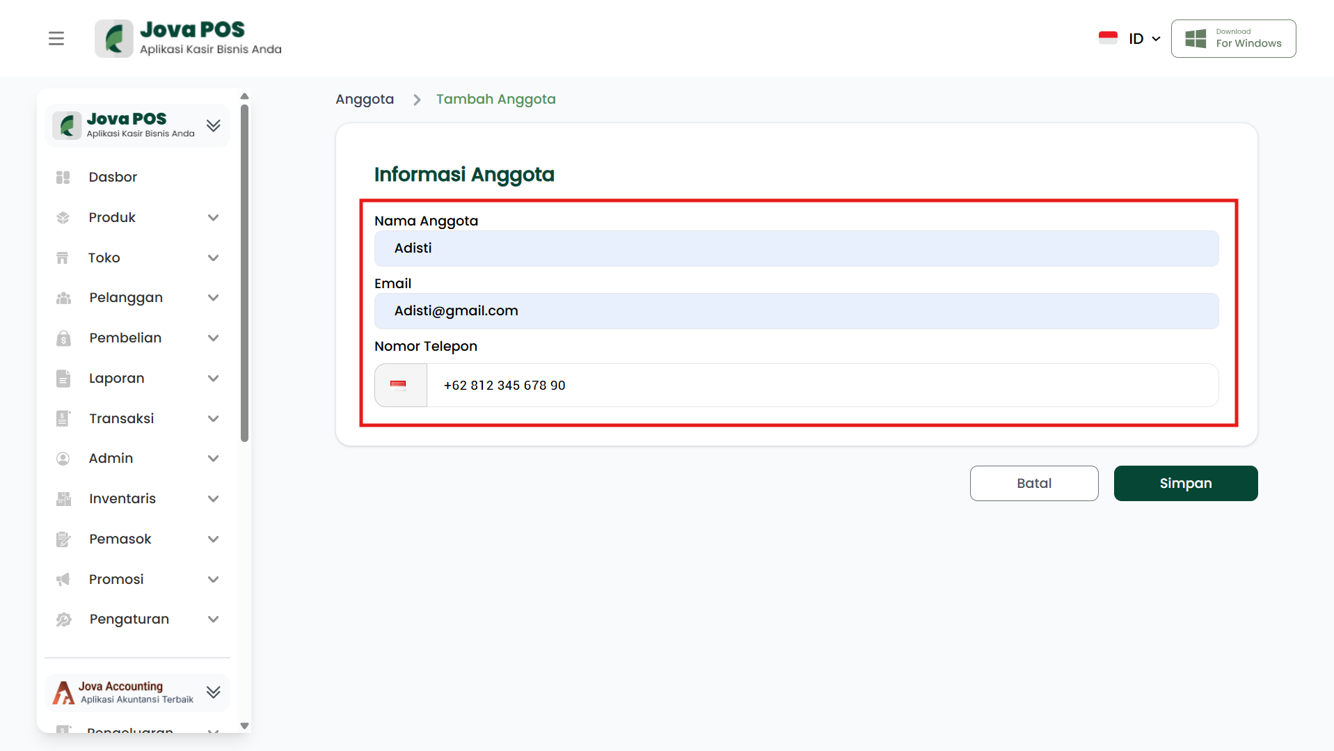 Nomor telepon digunakan sebagai identifikasi unik anggota. Pastikan nomor belum terdaftar sebelumnya.