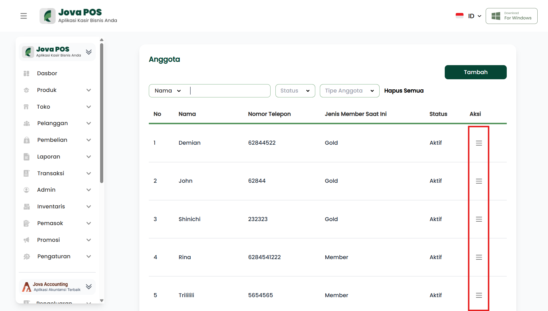 • Aksi: Tombol untuk melihat/edit detail anggota