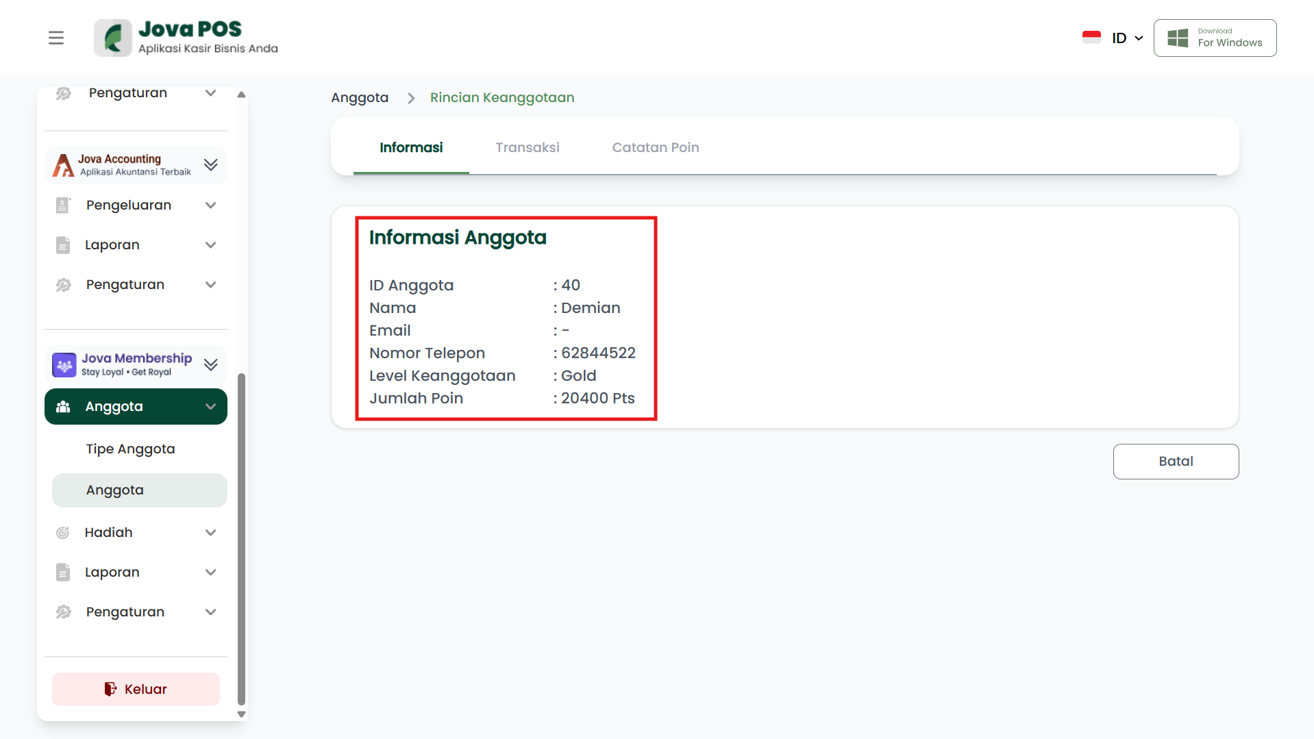 • Jenis Member Saat Ini: Level keanggotaan (Gold, Member, dll)