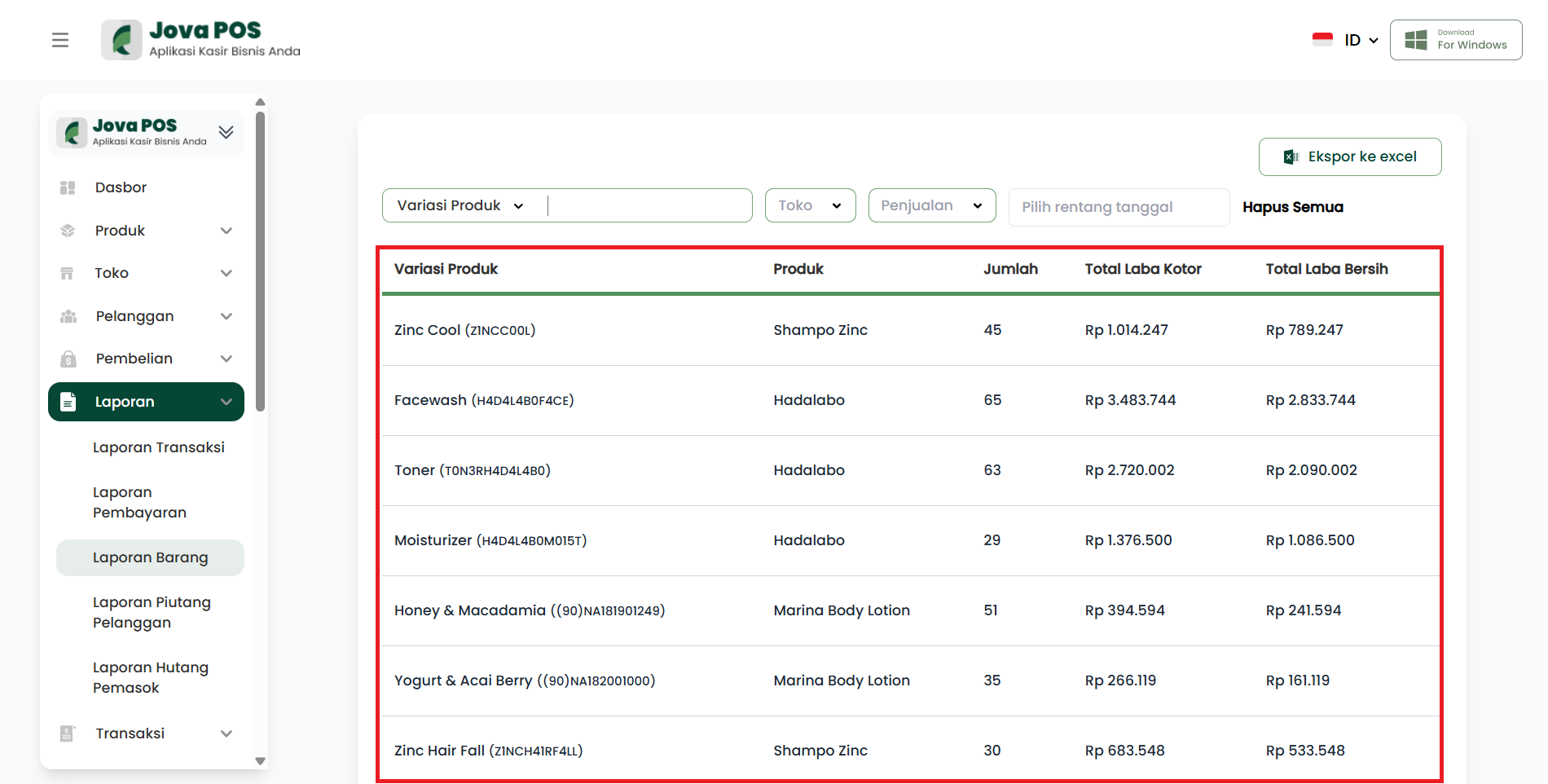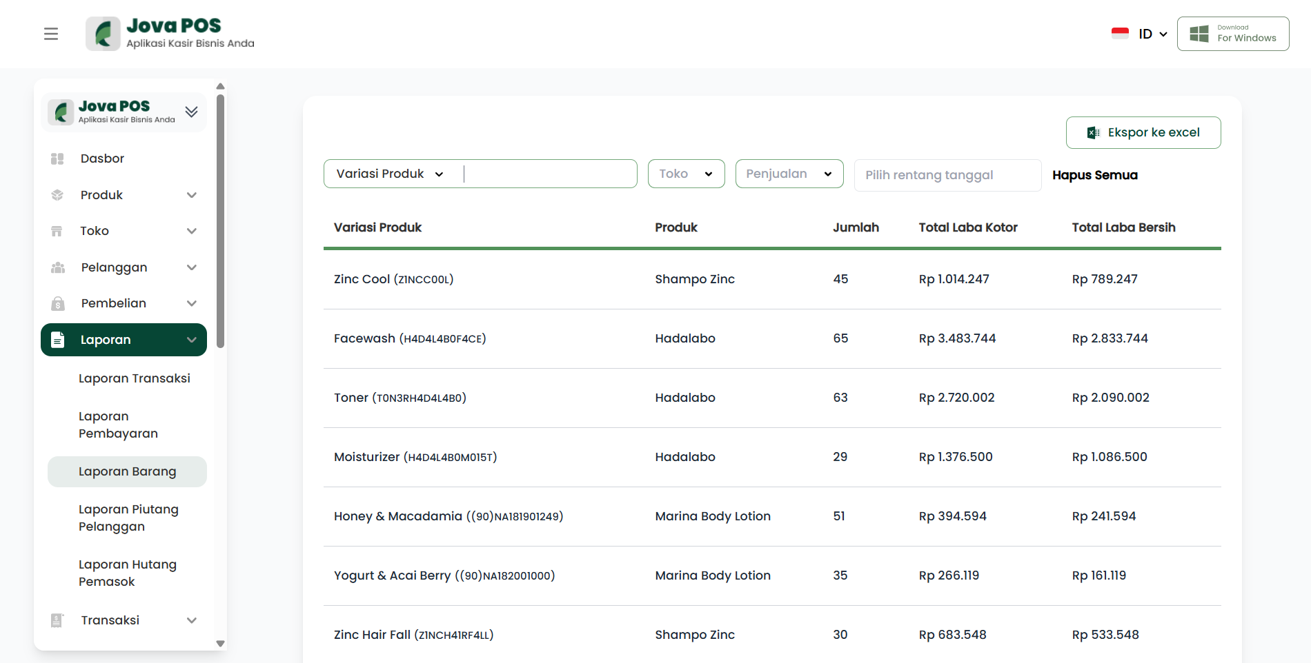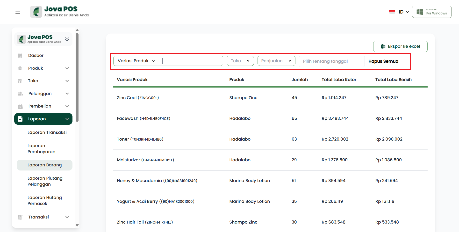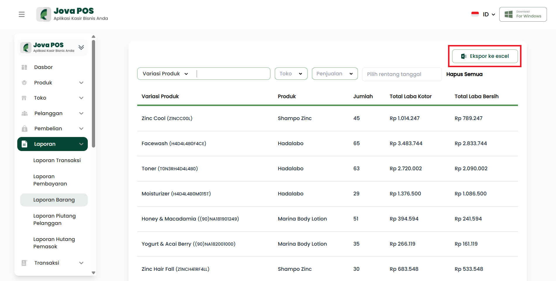 Dengan menggunakan Laporan Barang, Anda dapat memantau secara rinci kinerja produk Anda berdasarkan variasi dan kategori penjualan, serta mengevaluasi total laba yang dihasilkan.