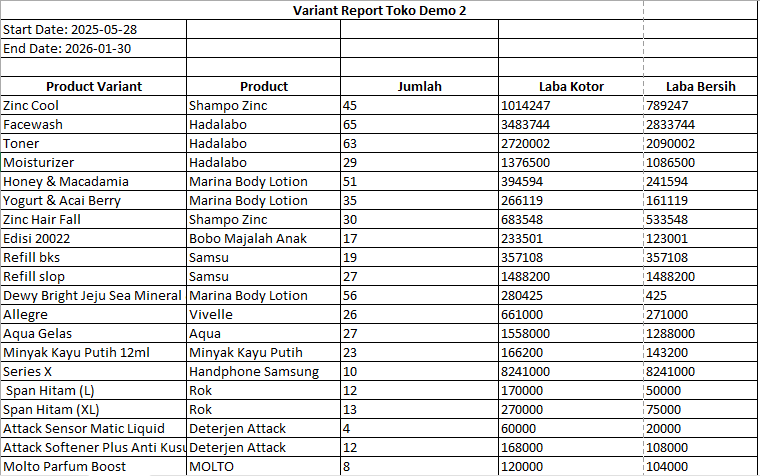 Laporan ini memberikan gambaran lengkap mengenai performa setiap produk berdasarkan variasi, yang membantu dalam menganalisa penjualan, laba kotor, dan laba bersih.