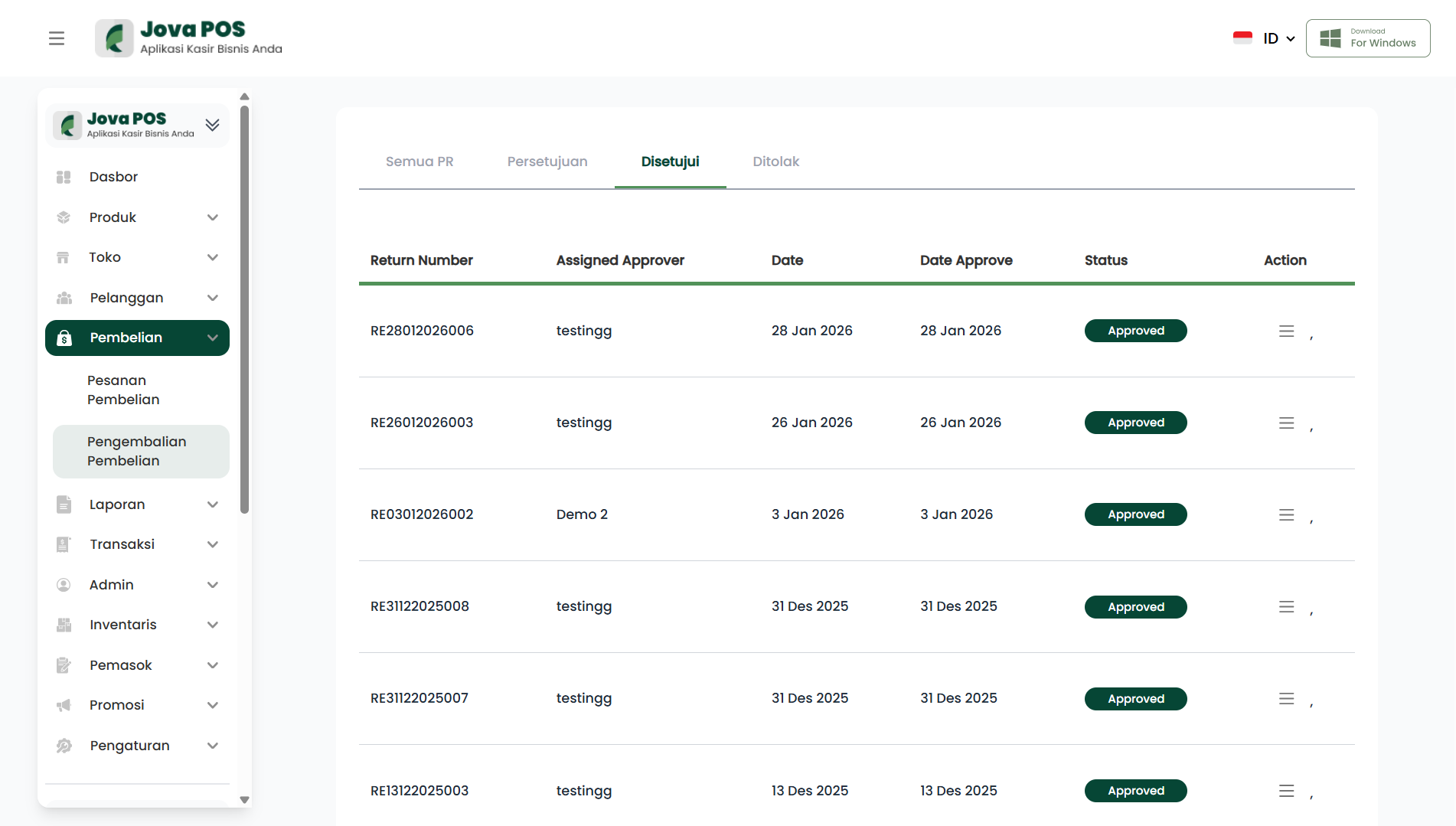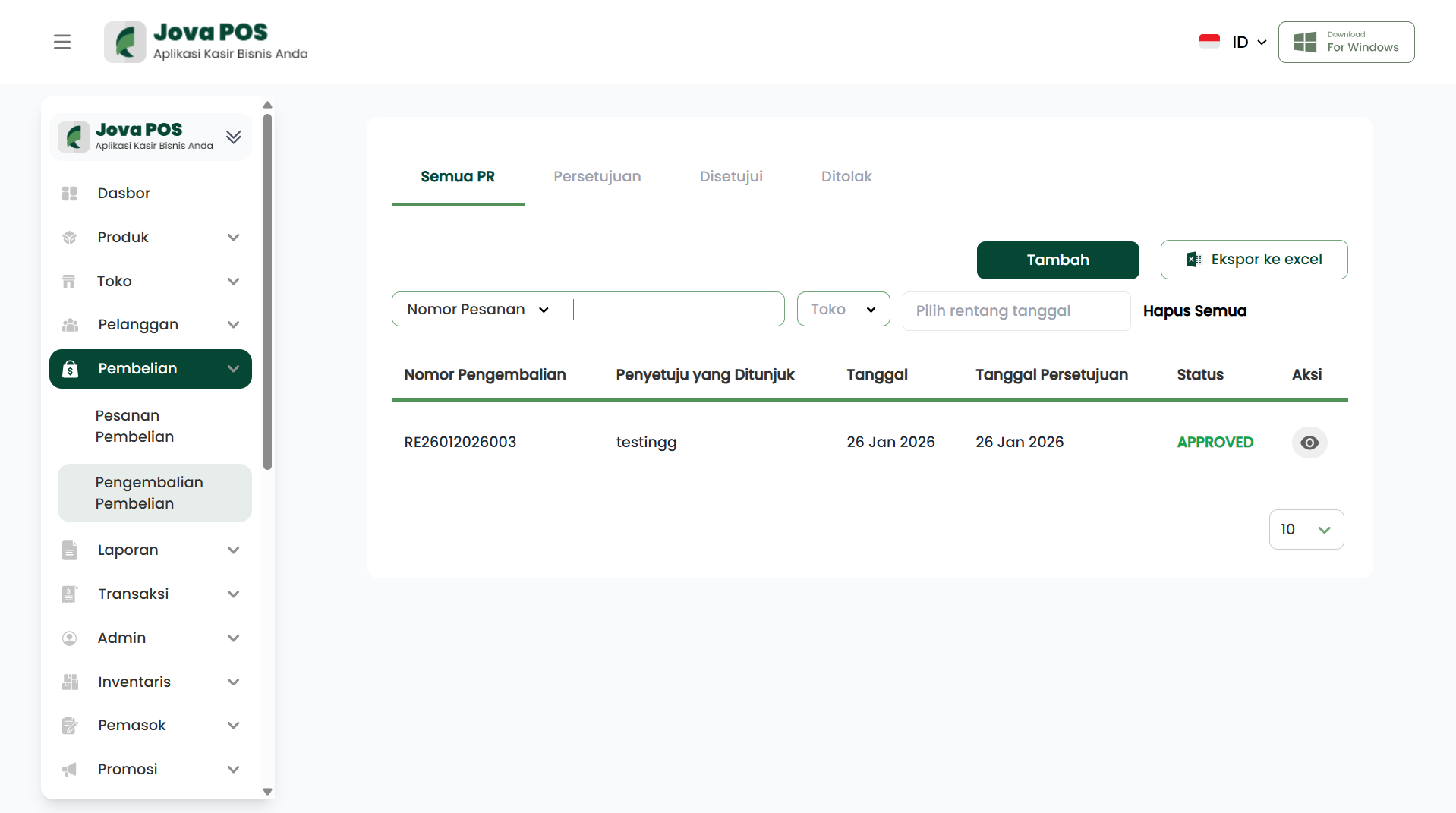 PR yang sudah disetujui akan muncul di tab Disetujui dengan status Approved dan menampilkan tanggal approve.