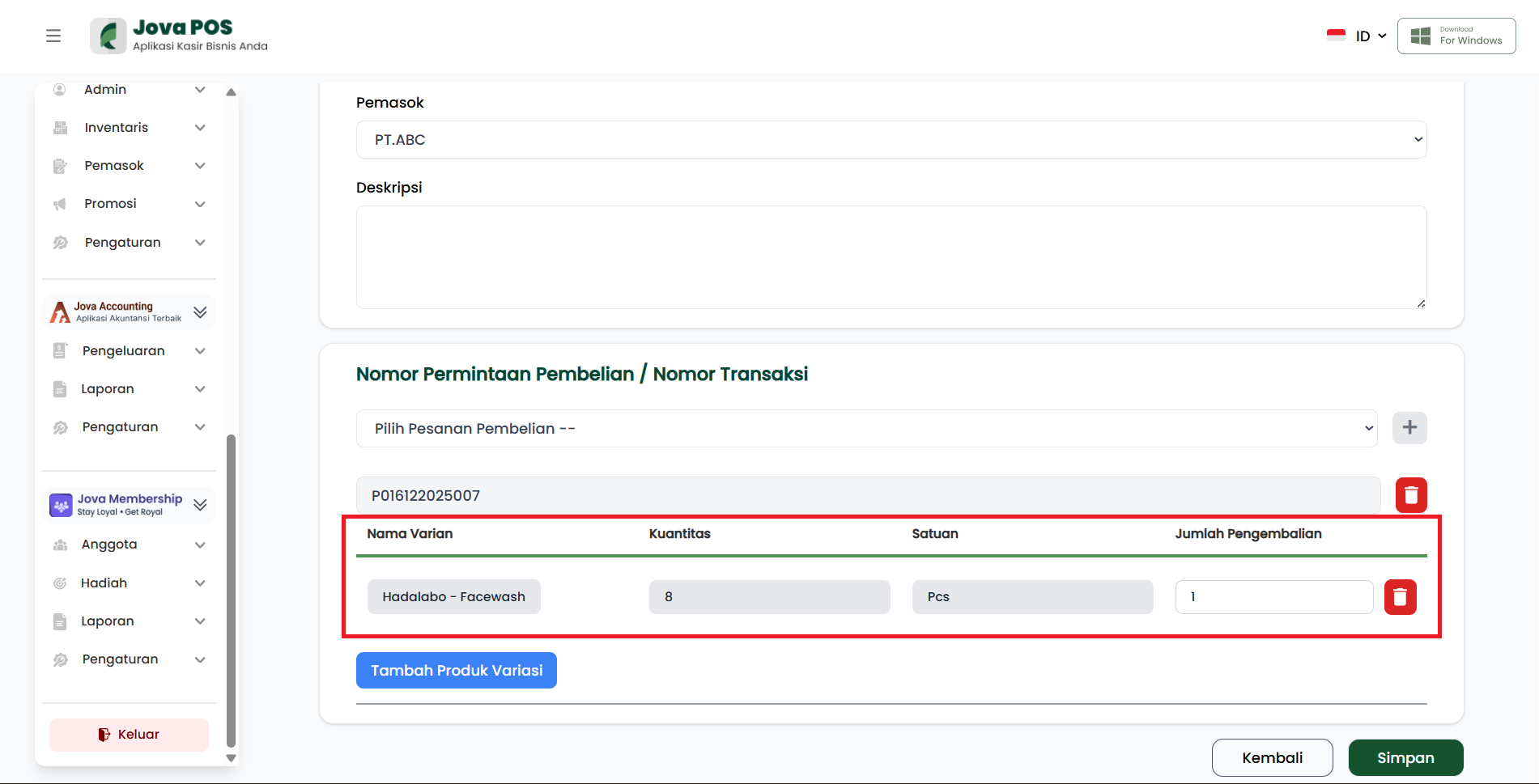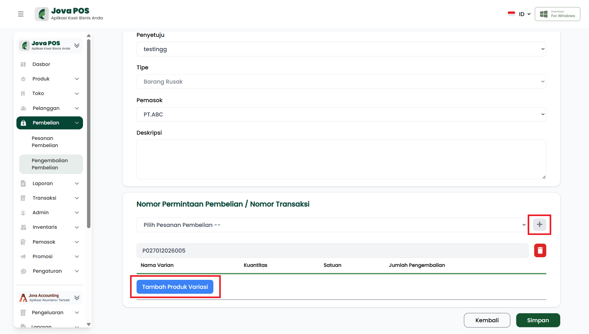 - Tambahkan variasi produk yang dikembalikan dan isi jumlah pengembaliannya.