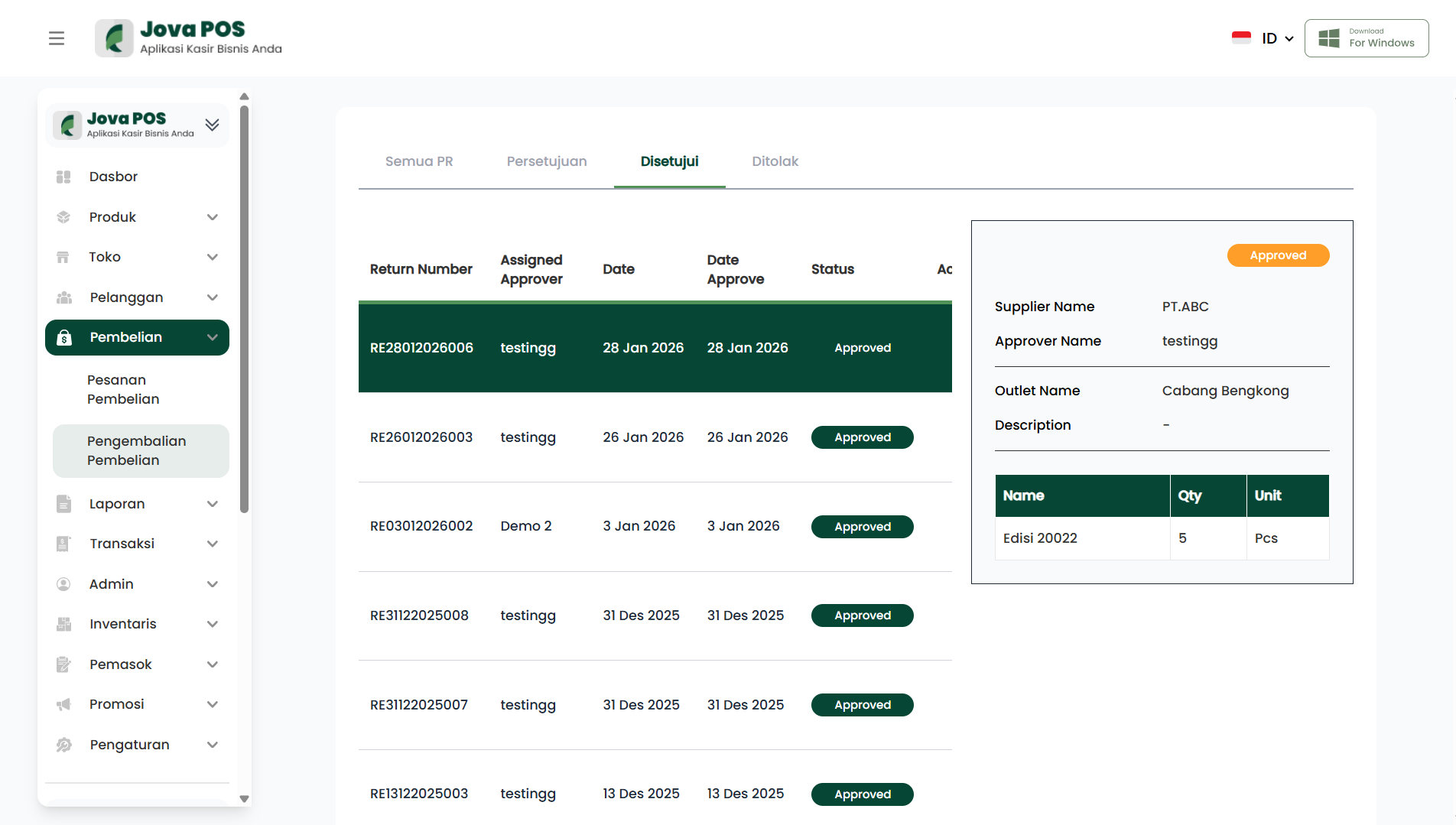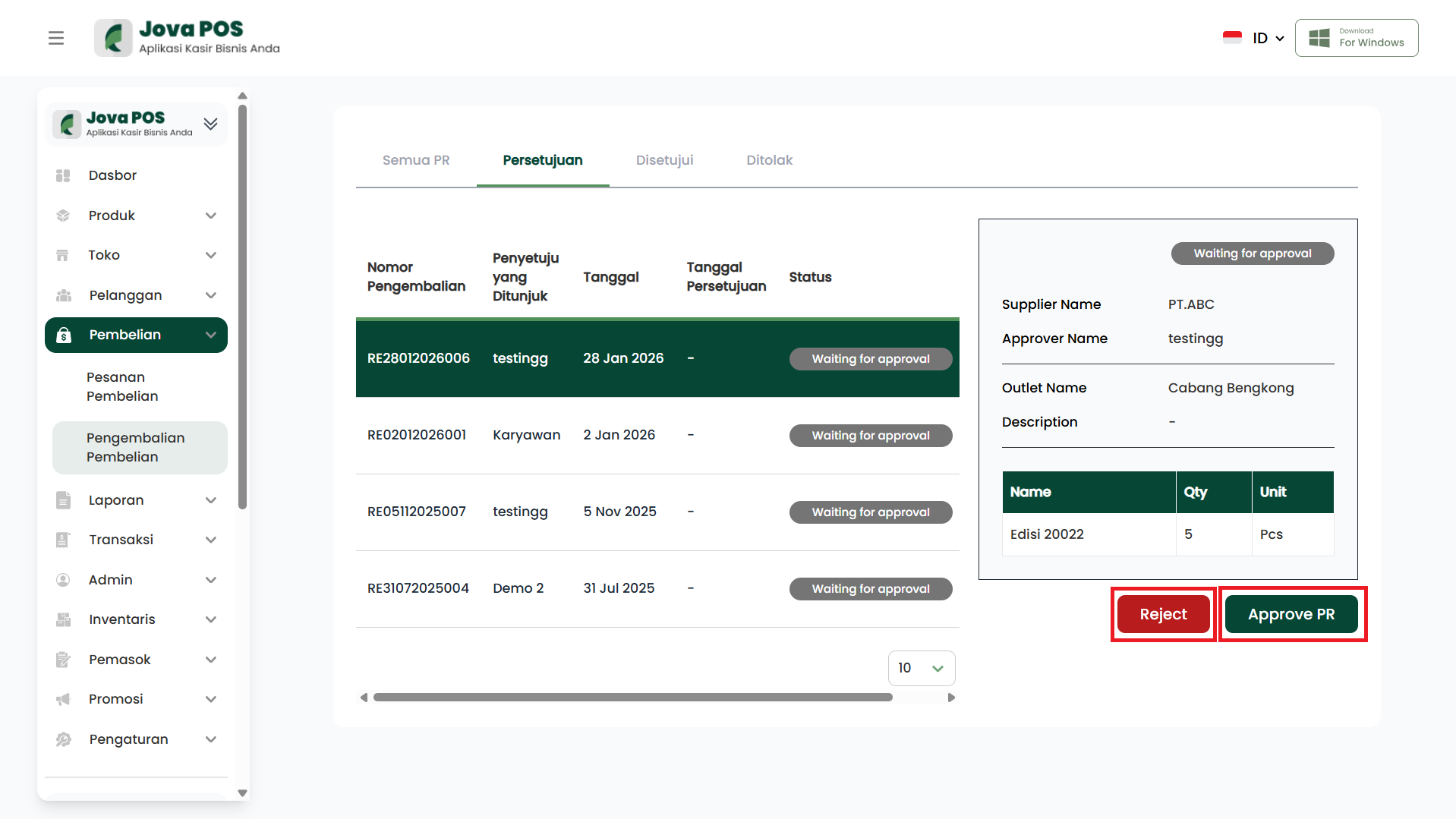 - Detail PR tampil di panel kanan (termasuk informasi supplier, approver, outlet, dan item).