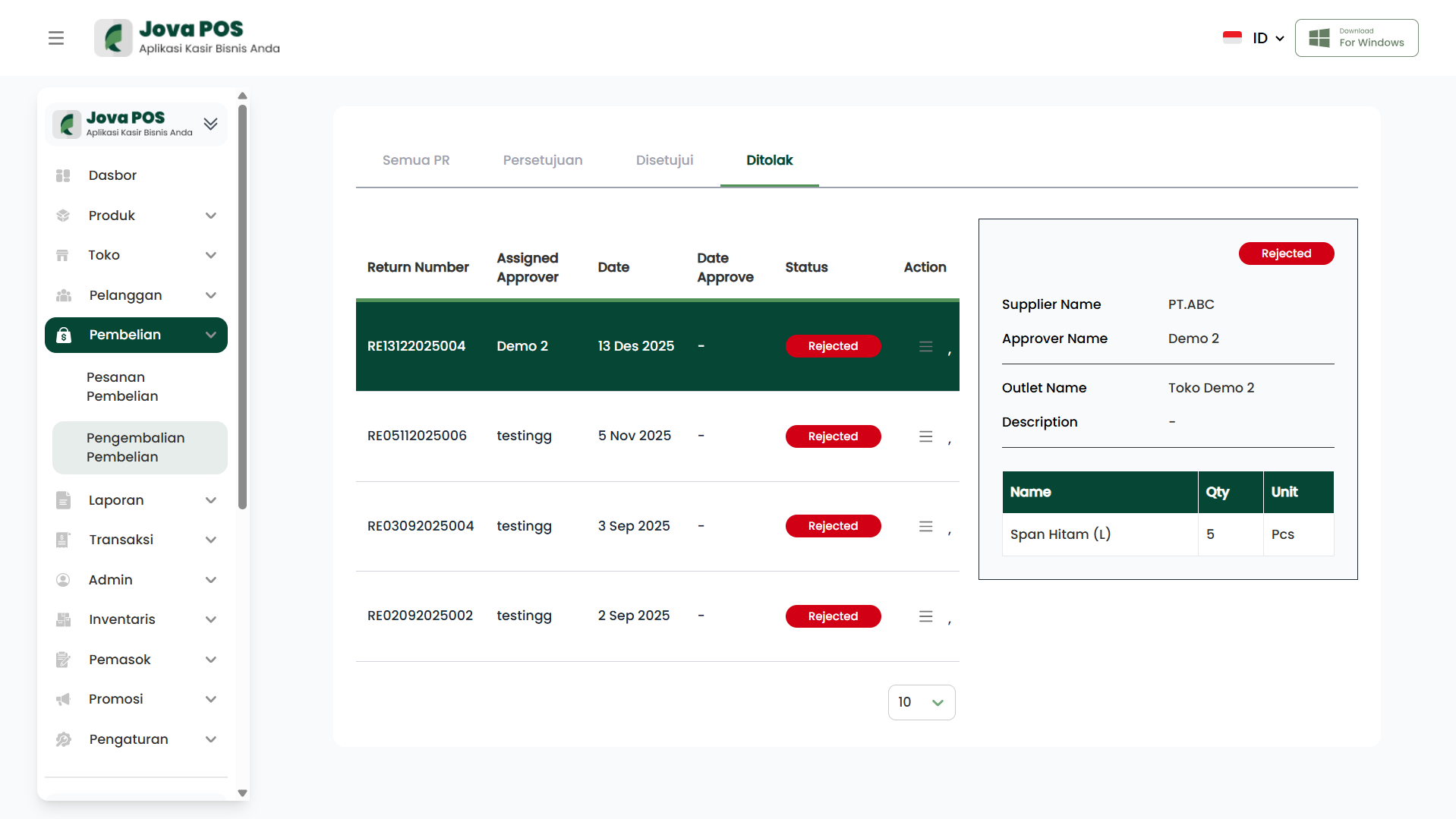 - Detail PR tampil di panel kanan, beserta badge Rejected dan informasi supplier, approver, outlet, serta item yang dikembalikan.