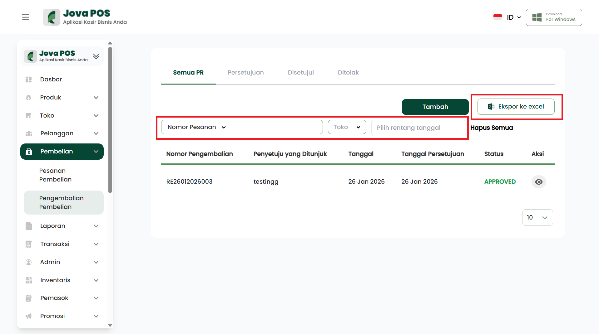 - Klik Ekspor ke excel untuk mengunduh data PR.
