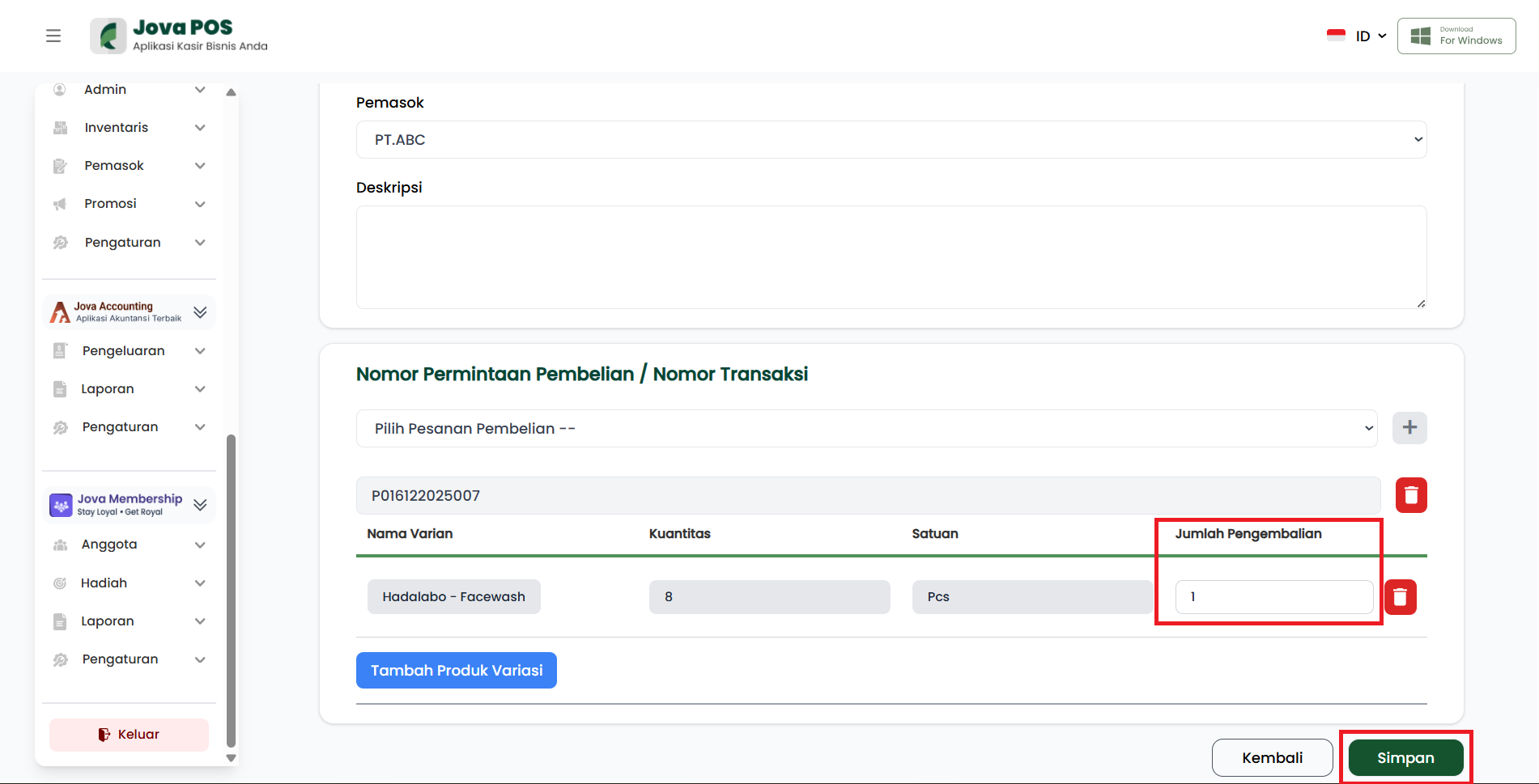- Pada kolom Jumlah Pengembalian, isi jumlah unit yang dikembalikan.