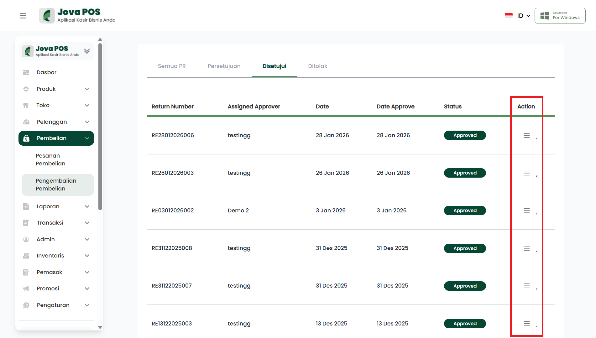 - Klik tombol Aksi (ikon tiga garis) pada baris PR.