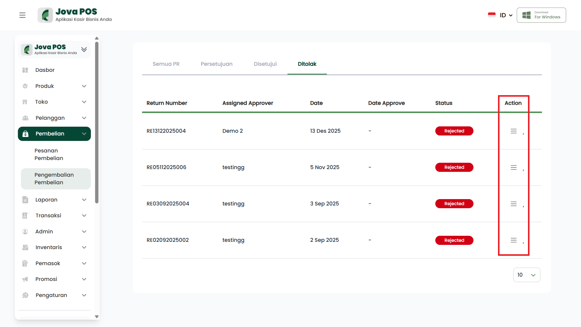 PR yang ditolak (Reject) akan berpindah ke tab Ditolak dan status akan tampil sebagai Rejected.