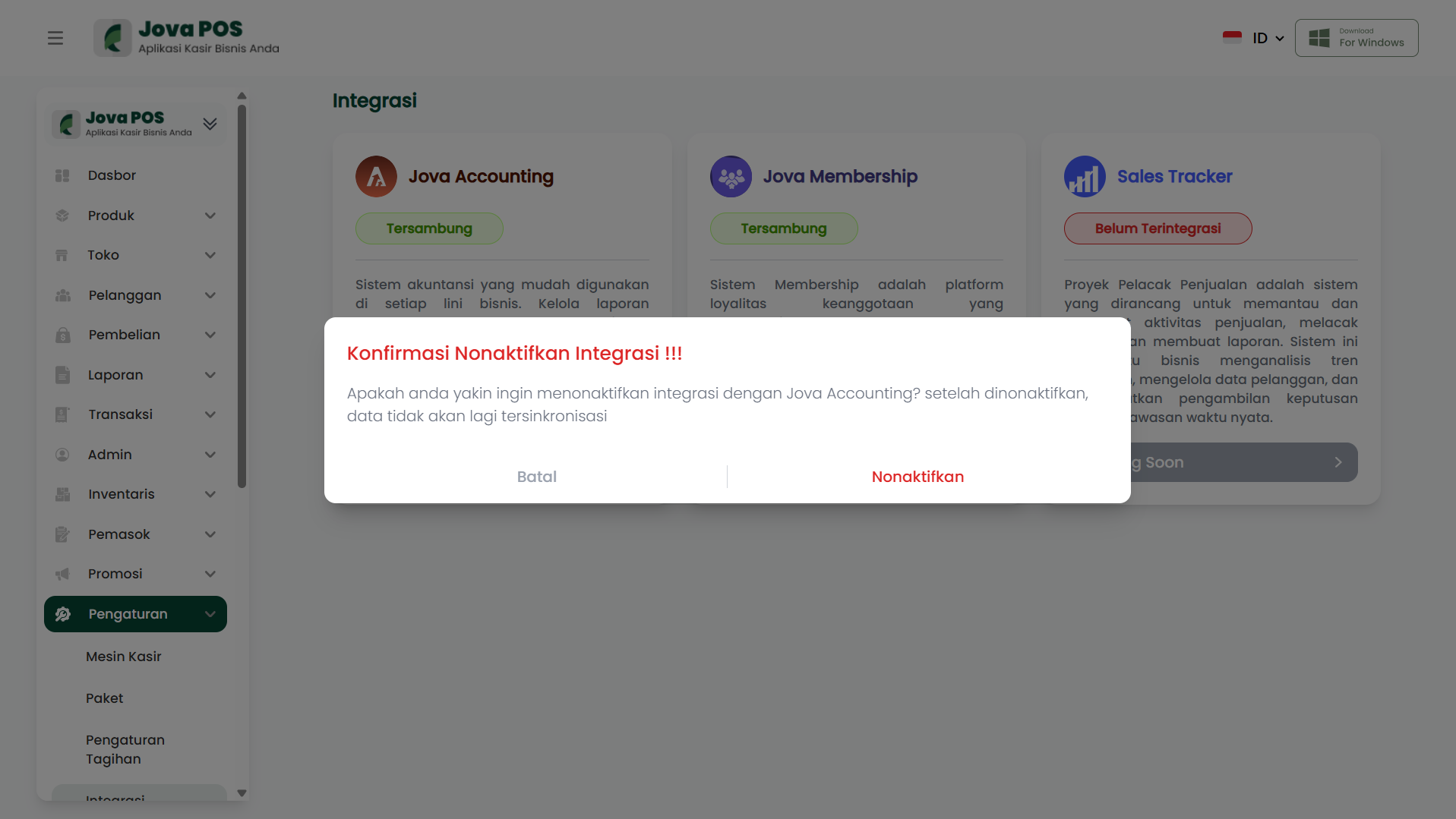 Contoh Tampilan Konfirmasi Nonaktifkan Integrasi: