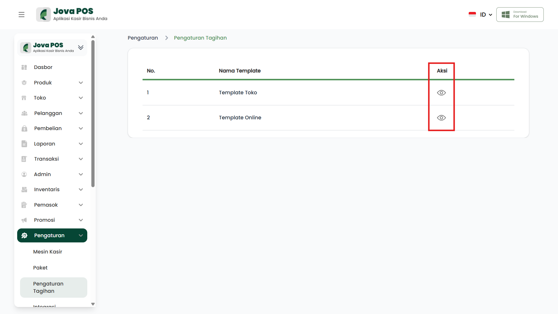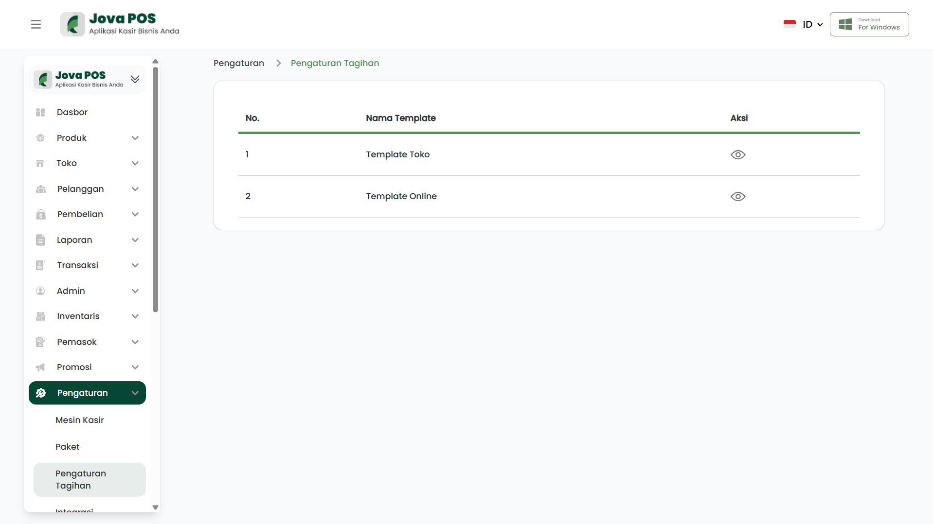 Pada bagian Pengaturan Tagihan, Anda dapat mengelola template tagihan yang akan digunakan untuk transaksi.
