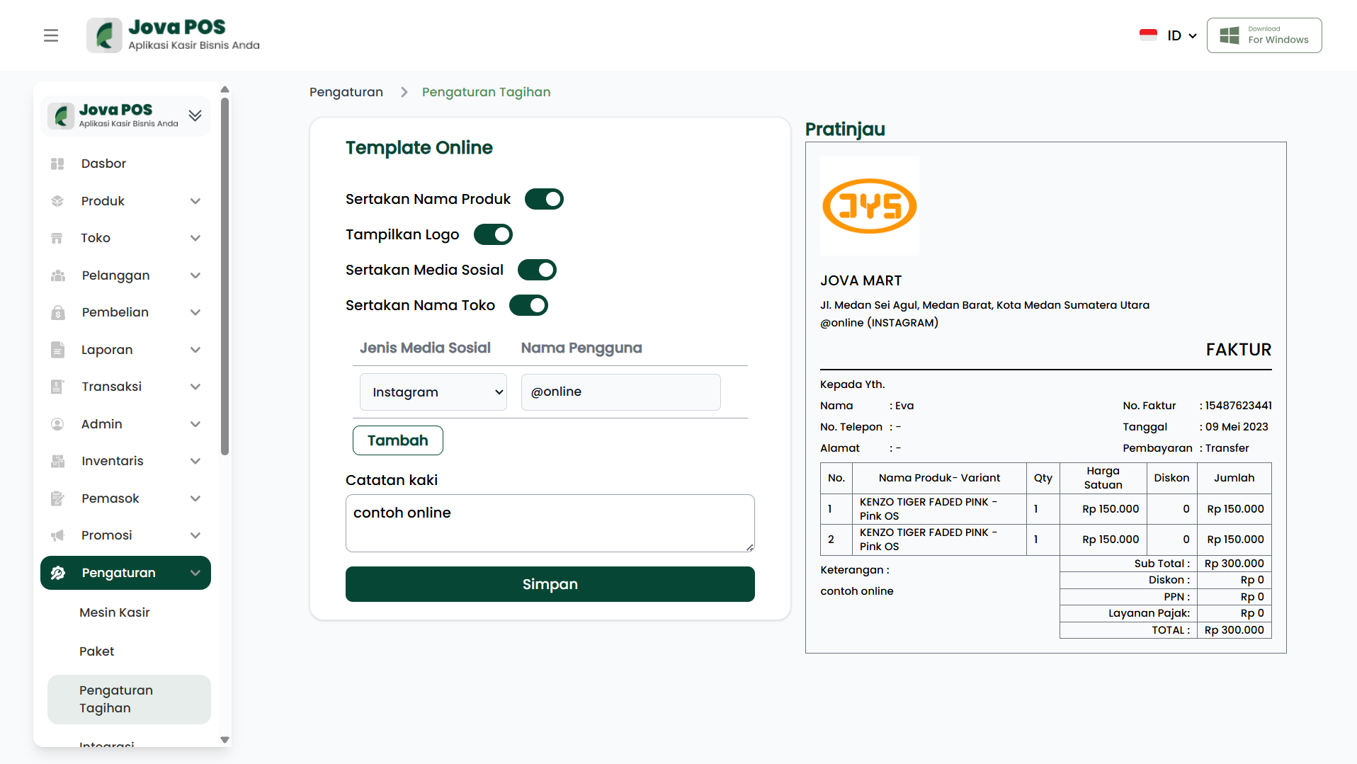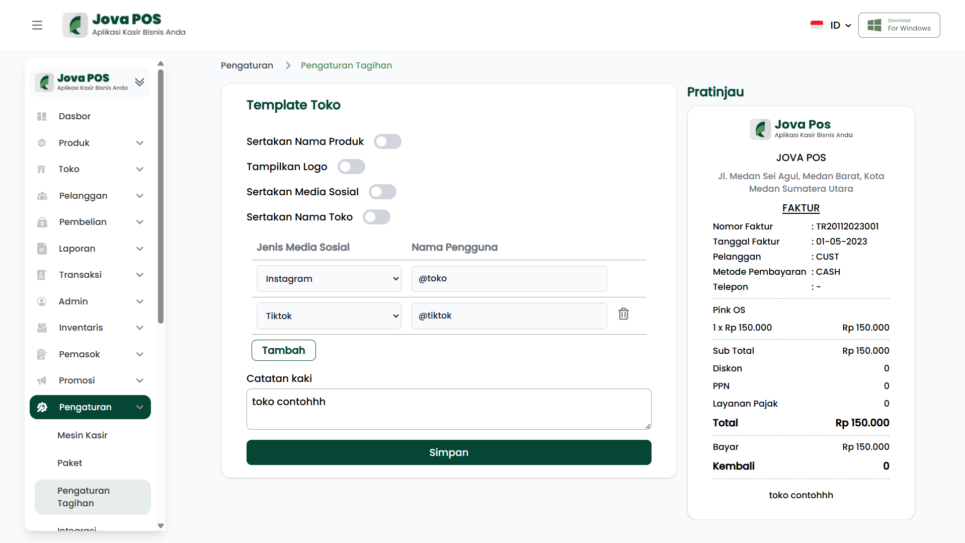 • Sertakan Nama Toko: Menampilkan nama toko pada tagihan.