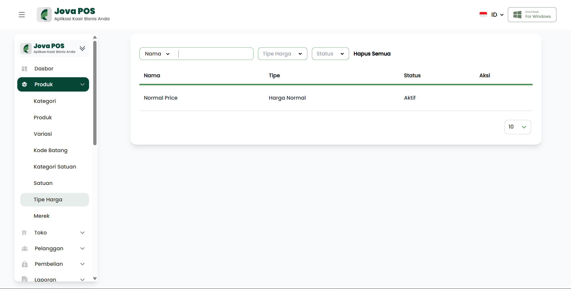 Tipe Harga di JOVA POS memungkinkan pengguna untuk melihat berbagai kategori harga produk. Halaman ini menampilkan jenis harga yang diterapkan pada produk, seperti Harga Normal, dan status tiap tipe harga apakah Aktif atau Tidak Aktif.