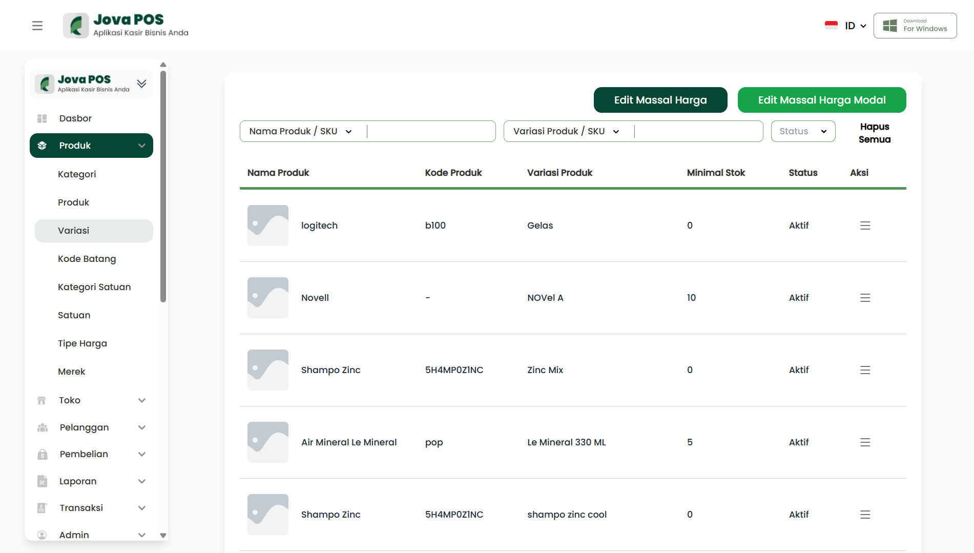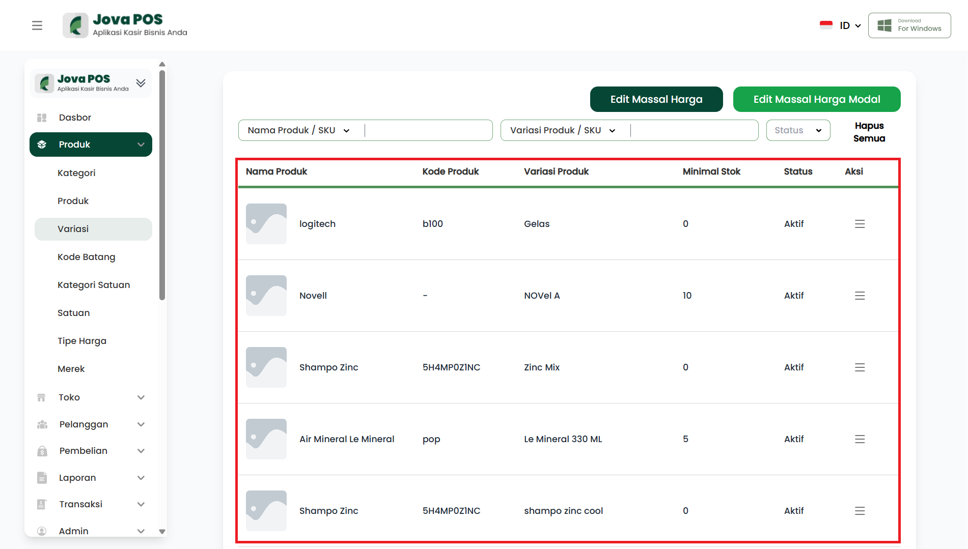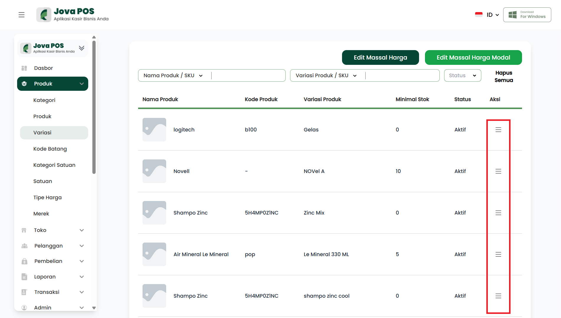 | Admin | Tambah, Edit, Edit Massal, Hapus |