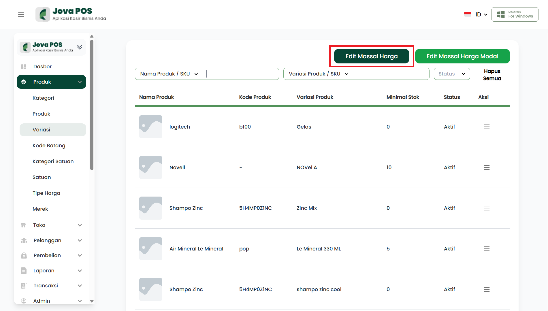Fitur Edit Massal digunakan untuk mengubah harga jual beberapa variasi sekaligus.