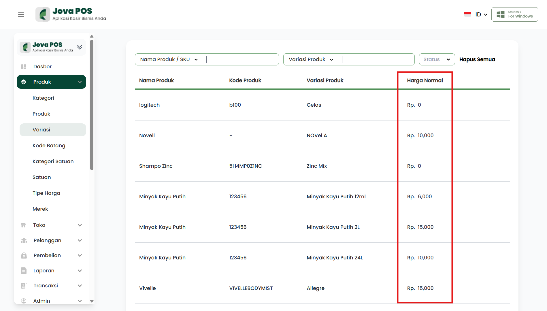 | Harga Jual | Mengubah harga jual banyak variasi |
