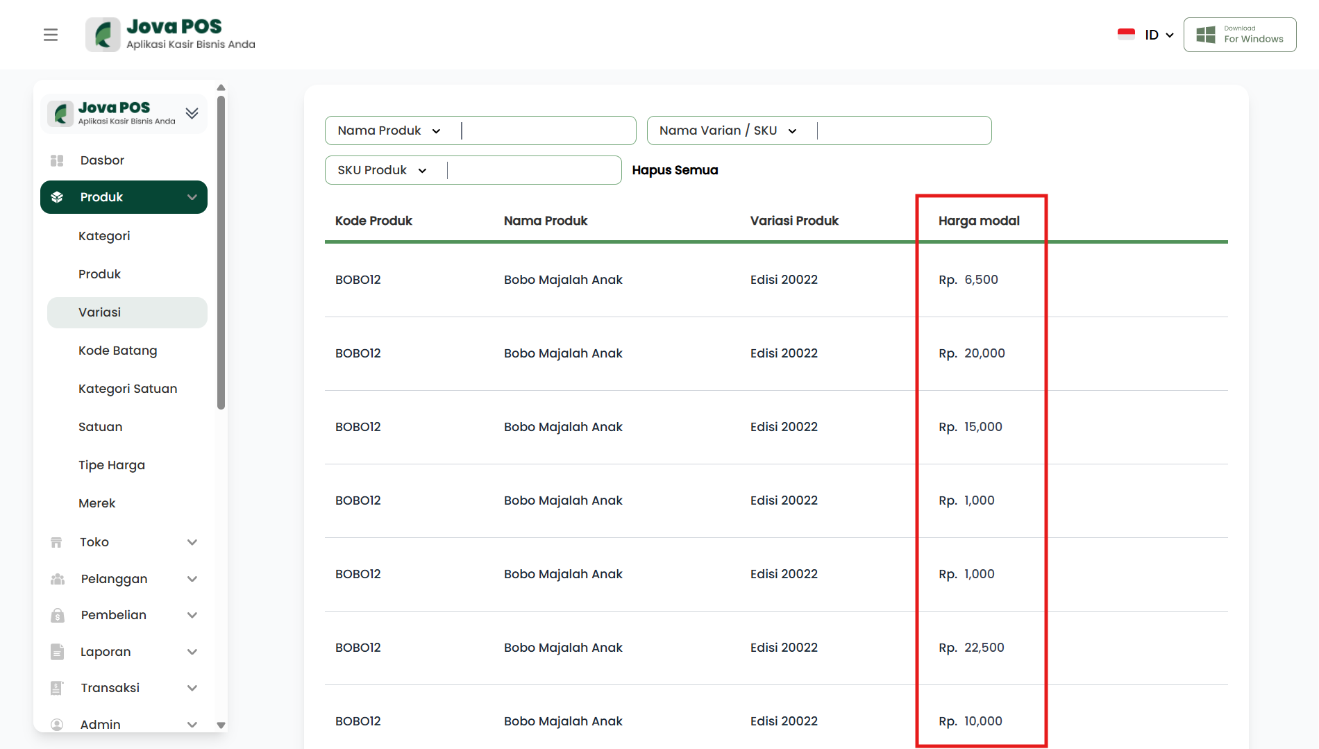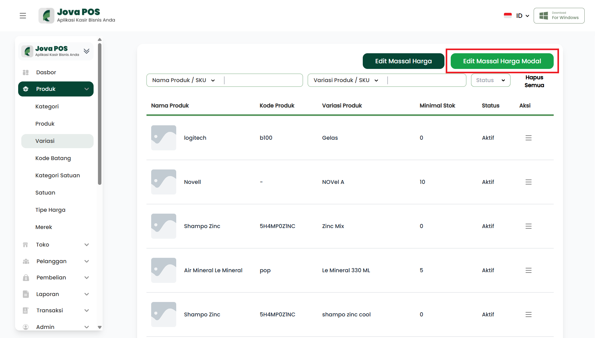 Fitur Edit Massal Harga Modal digunakan untuk mengubah harga modal beberapa variasi sekaligus.