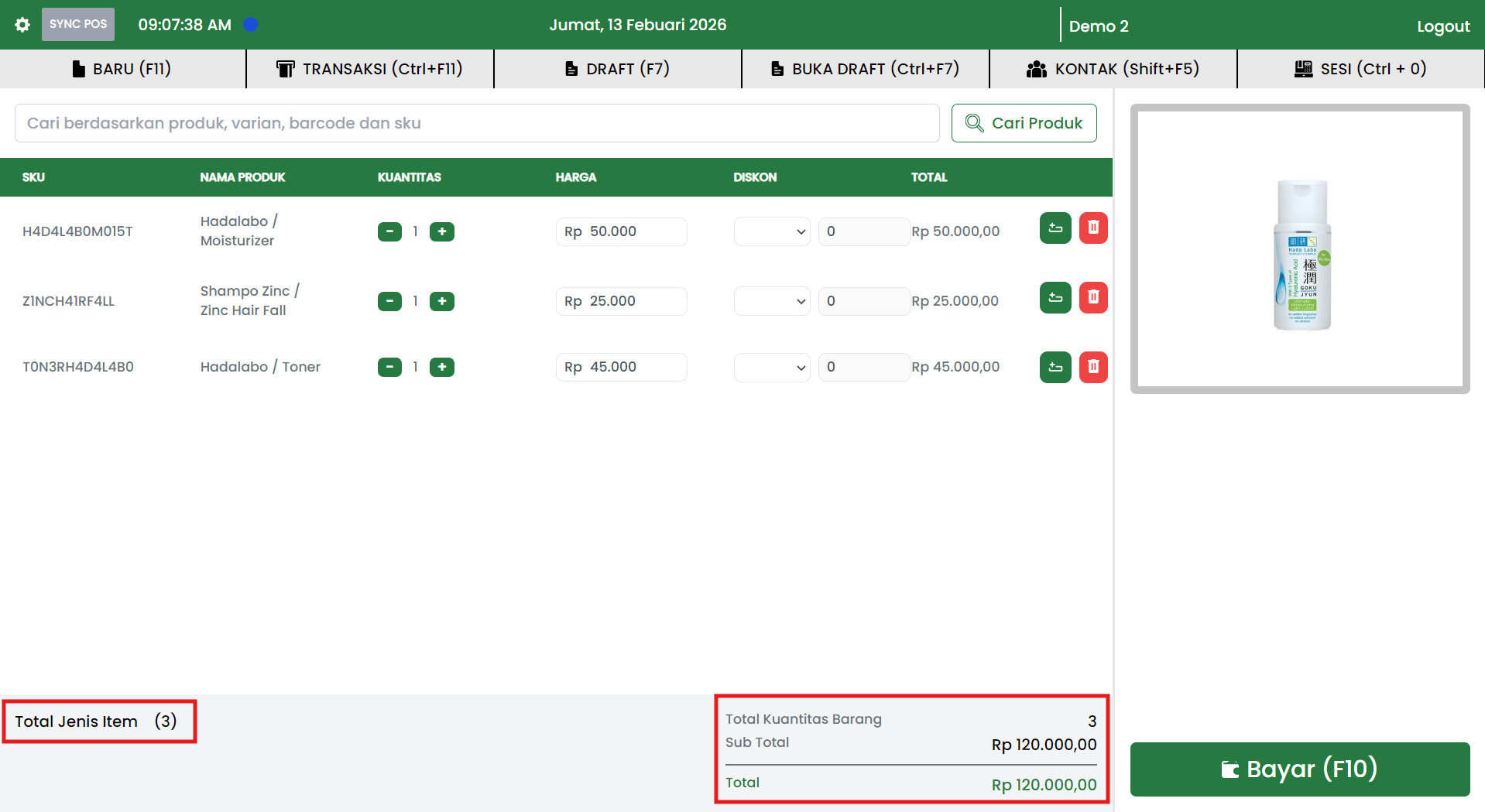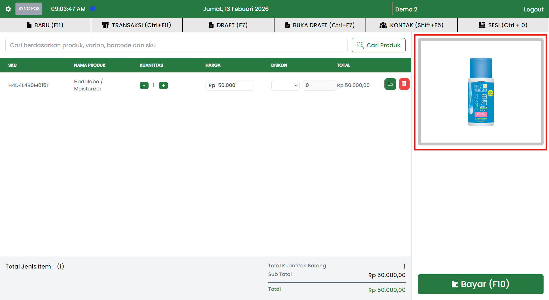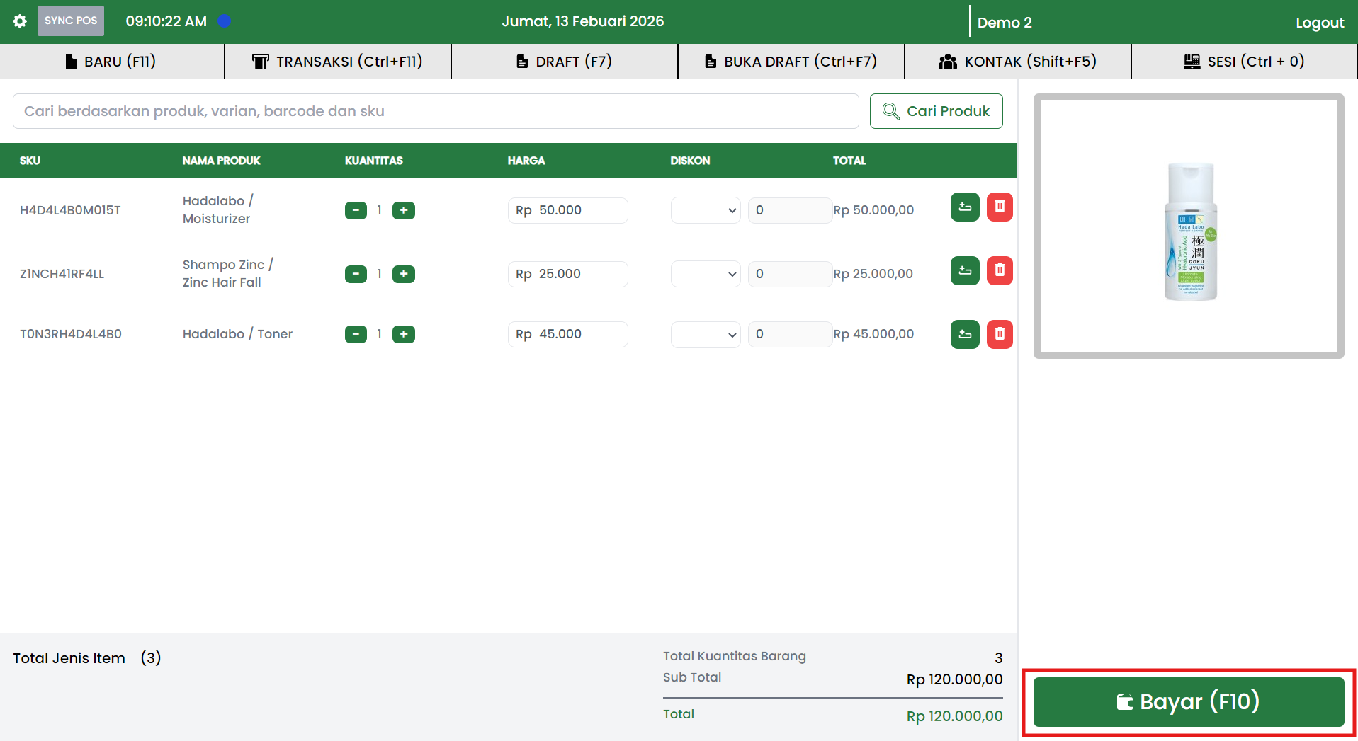 - DRAFT (F7): Menyimpan transaksi berjalan sebagai draft.